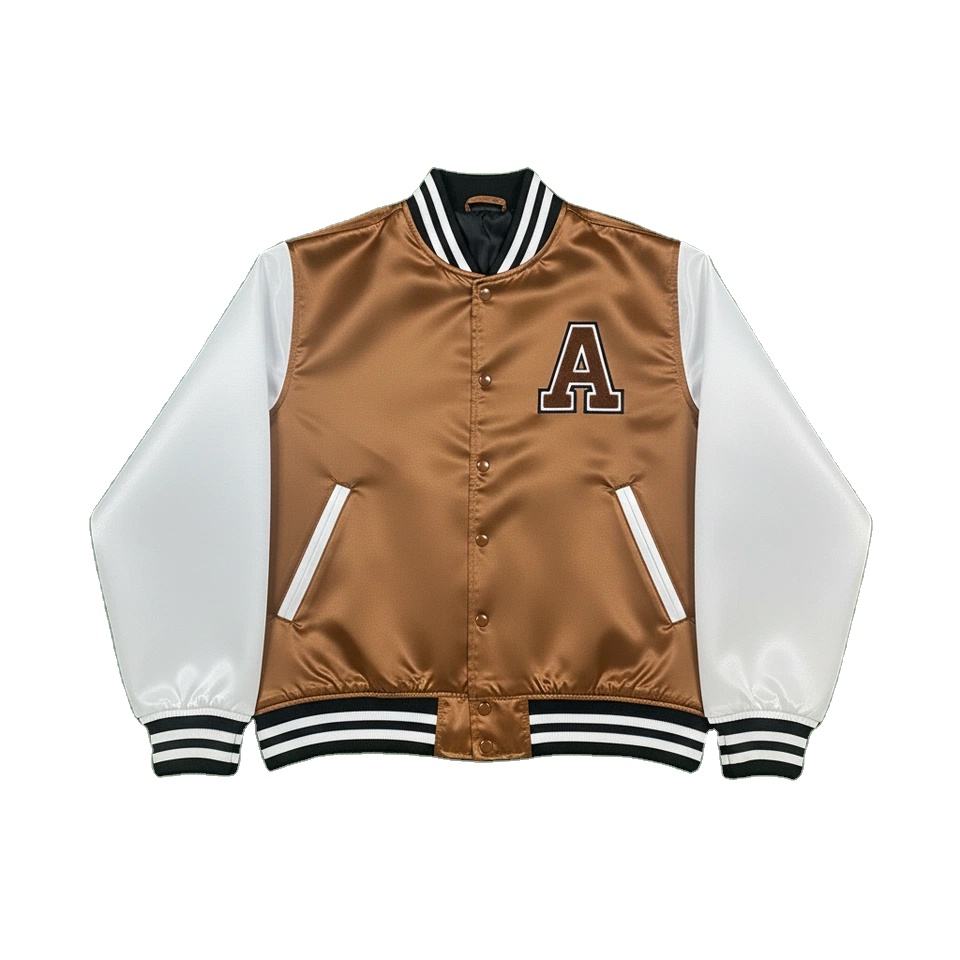 แจ็คเก็ตบอมเบอร์ผ้าซาตินลำลอง แจ็คเก็ตวาร์ซิตี้ผ้าซาตินแบบสั่งทำ แจ็คเก็ตเบสบอลปักอักษร แจ็คเก็ตเลตเตอร์แมนแบบยูนิเซ็กซ์