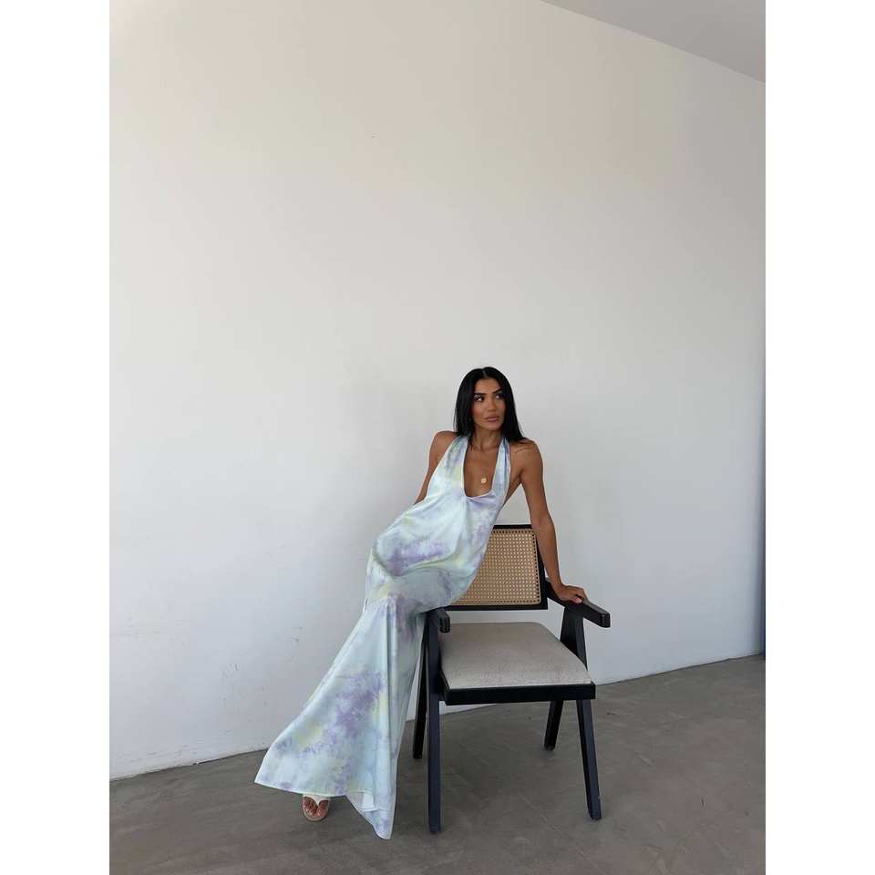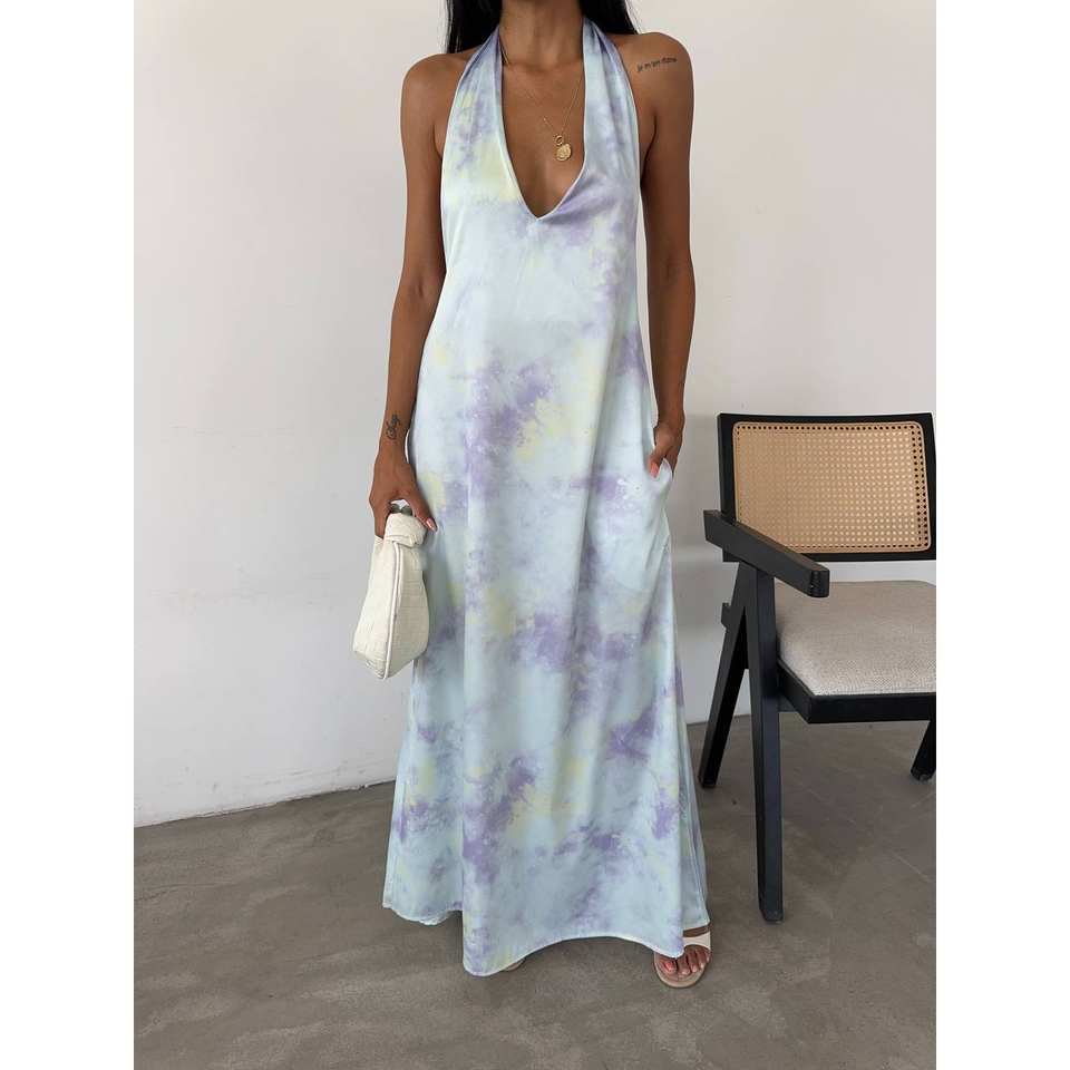 เดรสยาวผ้าซาตินลำลอง คอแบบผูก ดีไซน์ระบายอากาศได้ดี ลายพิมพ์สไตล์สบายๆ