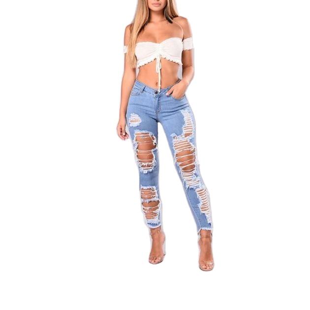 กางเกงยีนส์เอวสูงของผู้หญิงกางเกงเอวสูงรัดรูปขาดตรงระบายอากาศเซ็กซี่ลำลอง