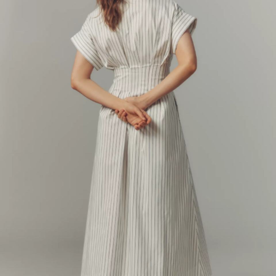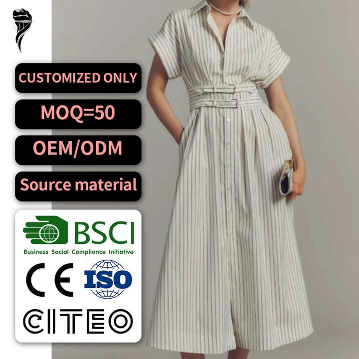 ชุดเดรสเชิ้ตแบบลำลองพร้อมเอวยางยืด ผ้าทอระบายอากาศได้ดี ชุดเดรสเชิ้ตแบบกระดุมคู่