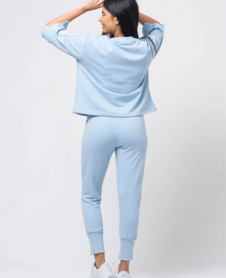 ชุดวอร์มสองชิ้นแนวสปอร์ตลำลองสำหรับใส่วิ่งออกกำลังกายกางเกงขาบานสีพื้นชุดวอร์มระบายอากาศได้โลโก้ตามต้องการสำหรับฤดูใบไม้ร่วง