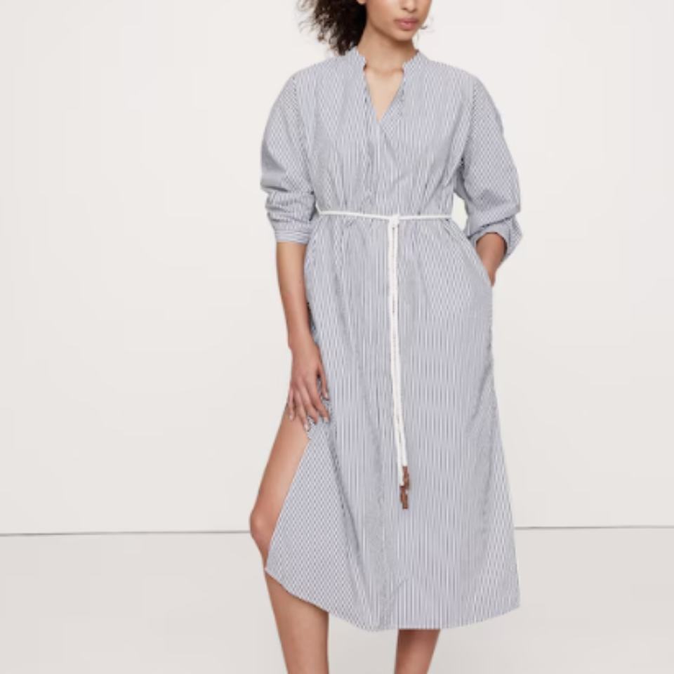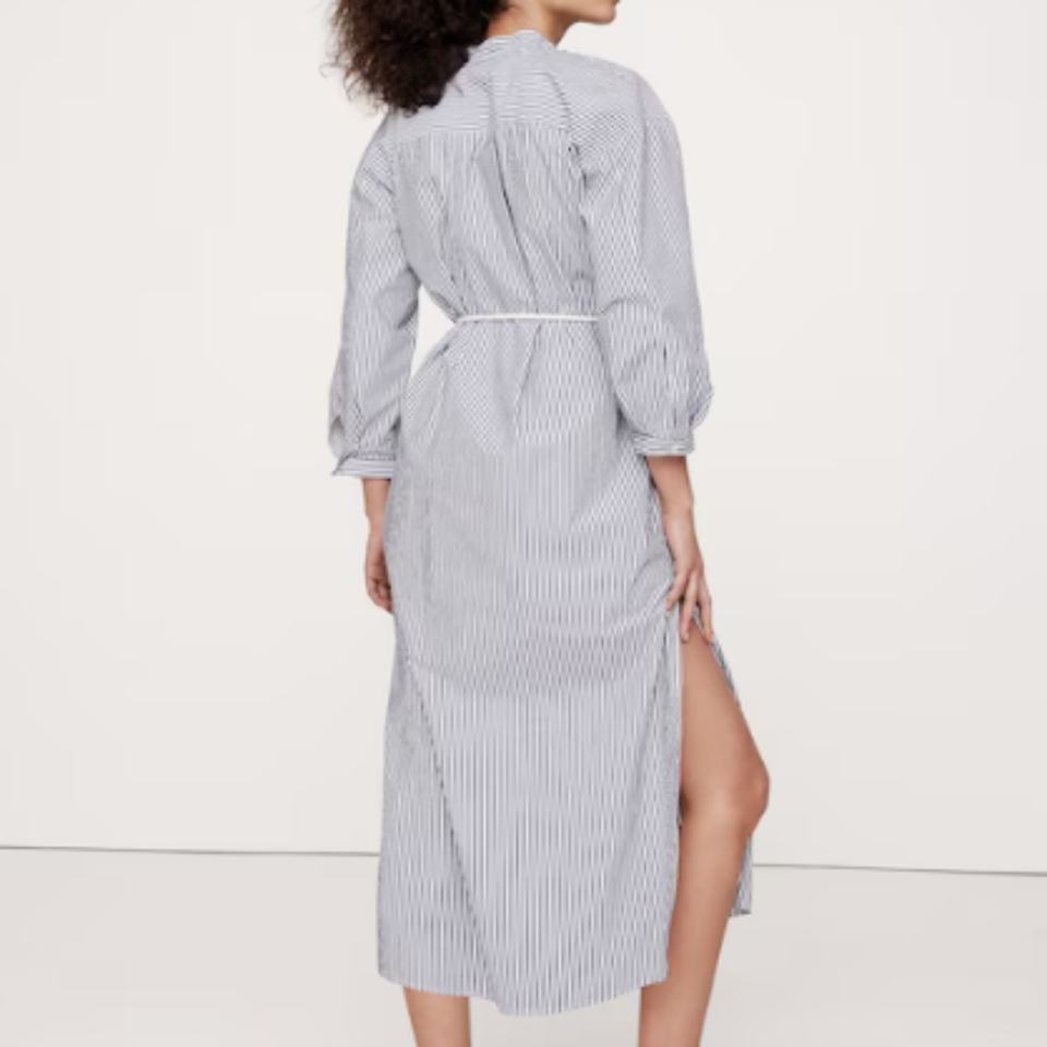 เดรสเชิ้ตลายทางลำลองพร้อมเชือกรูดเอว เดรสยาวปานกลางแขนยาวทรงโอเวอร์ไซส์พร้อมผ่าข้าง