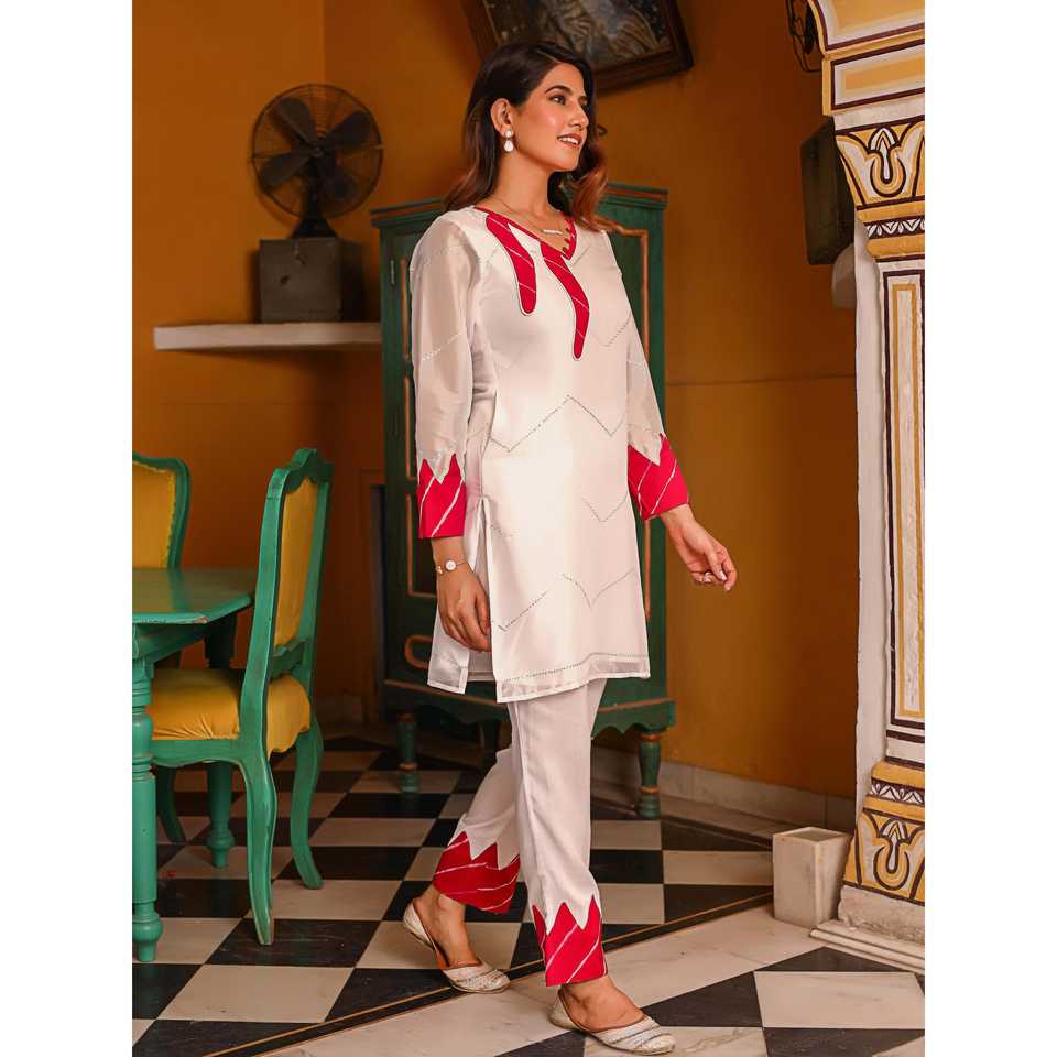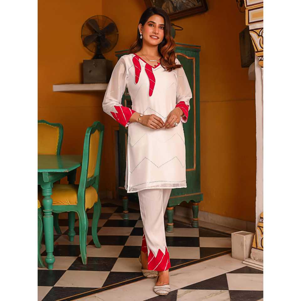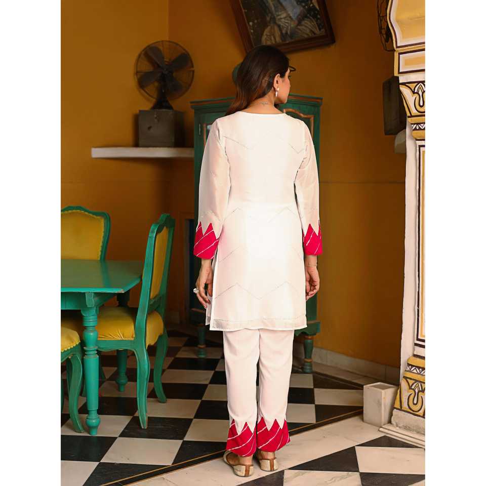 ชุดคุรตะสีขาวสไตล์ลำลองพร้อมลายปักเลเฮริยาสีชมพู ไซส์ XS