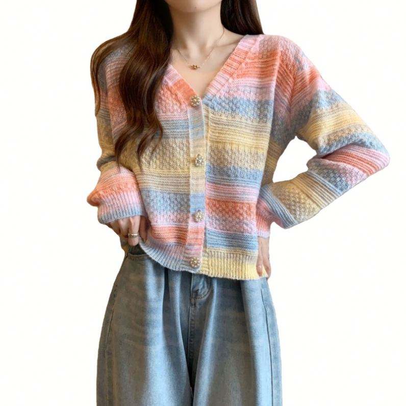 เสื้อคาร์ดิแกนถักผ้าโพลีเอสเตอร์สไตล์ลำลองสำหรับผู้หญิงเสื้อถักลายทางสีรุ้งแบบบางเสื้อถักด้านนอกแบบเปิด