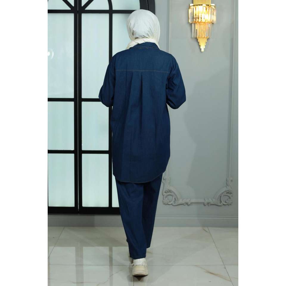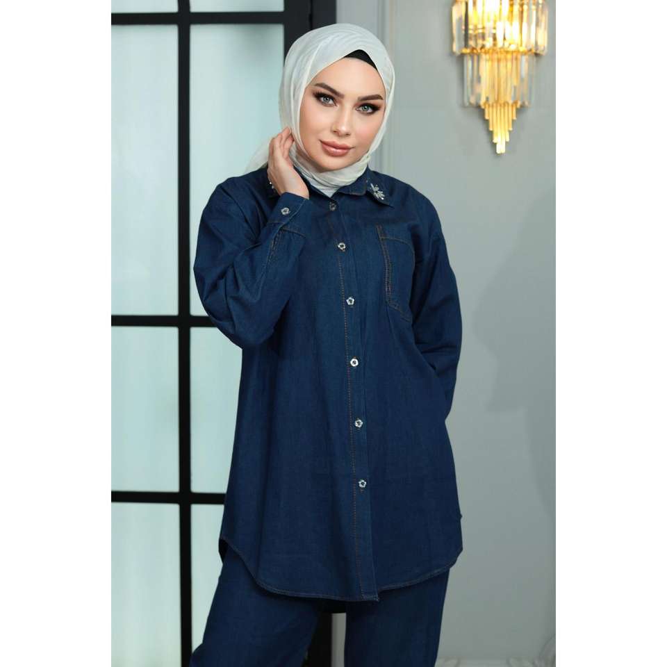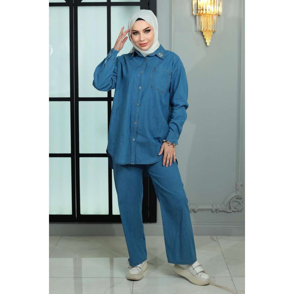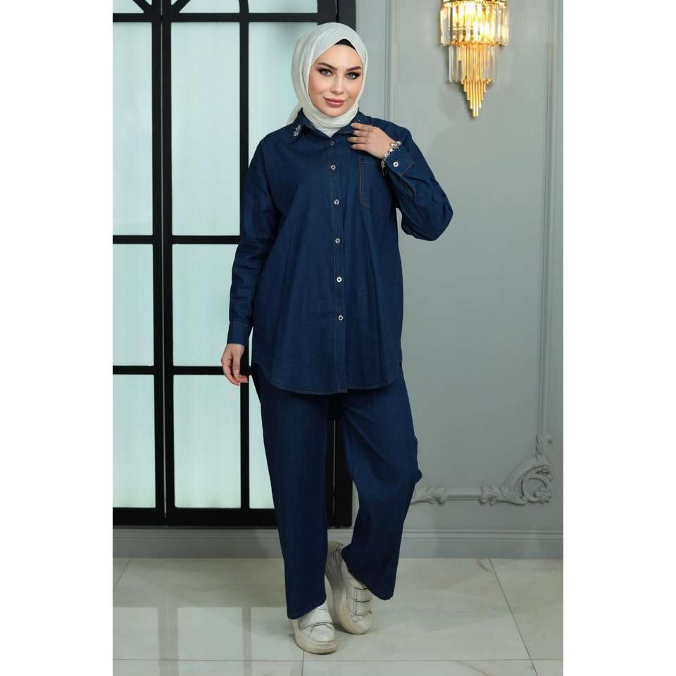 ชุดเซ็ตยีนส์ผู้หญิงสไตล์ลำลองประดับหมุด 2 ชิ้น ไซส์ XL ทรงหลวม กางเกงขาสั้นเหนือเข่าและเสื้อท่อนบน พร้อมกางเกงขายาวระดับกลางสำหรับฤดูหนาว