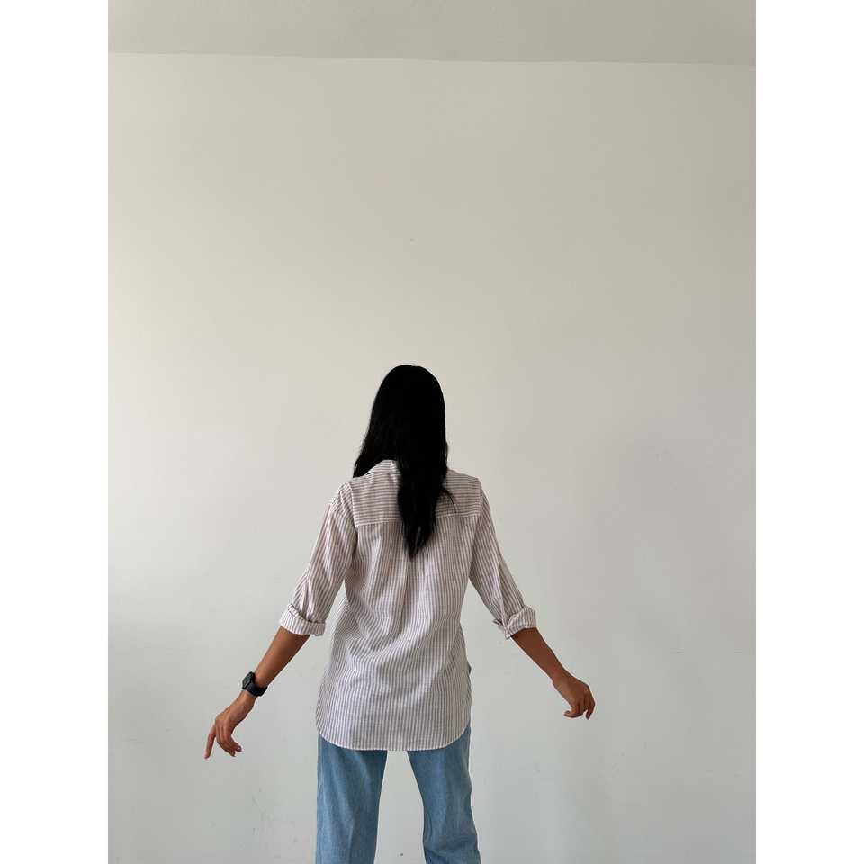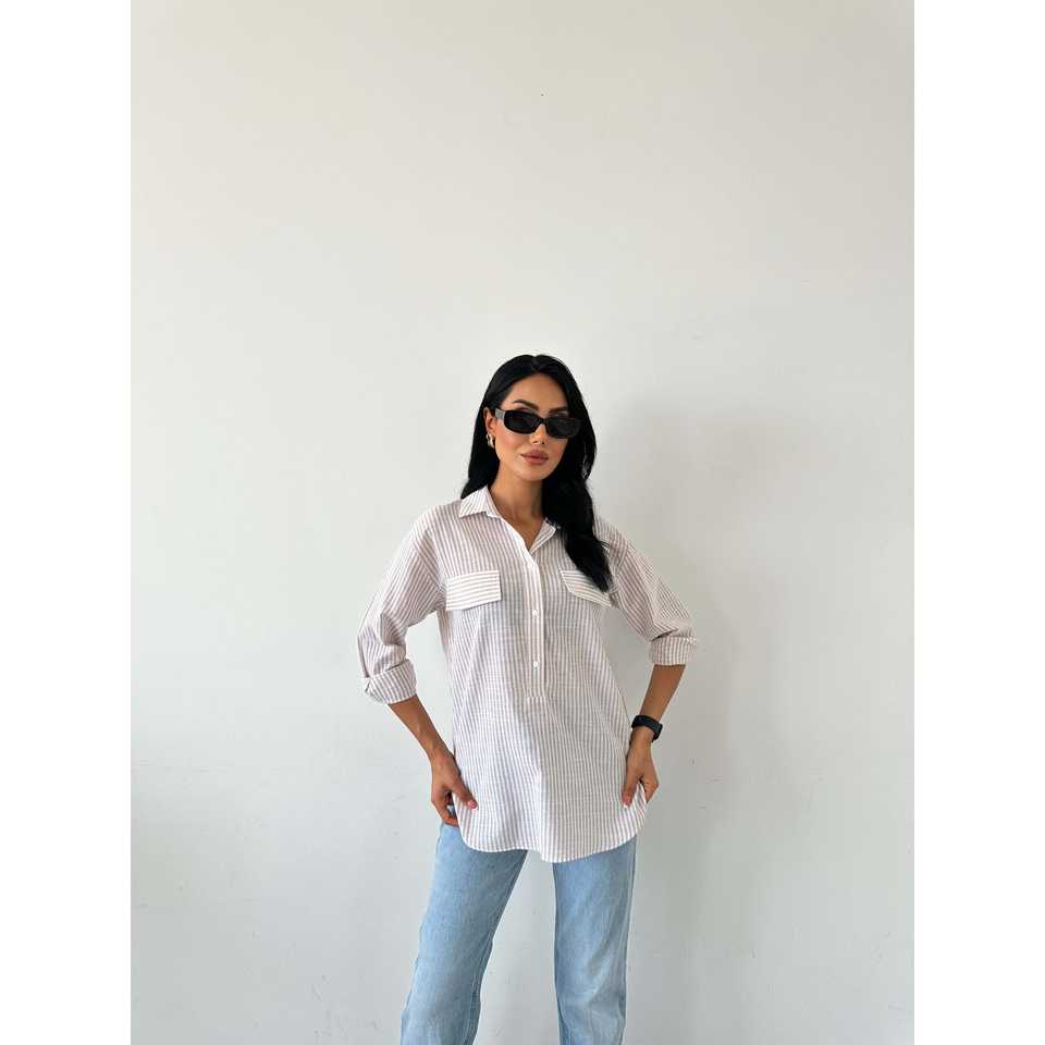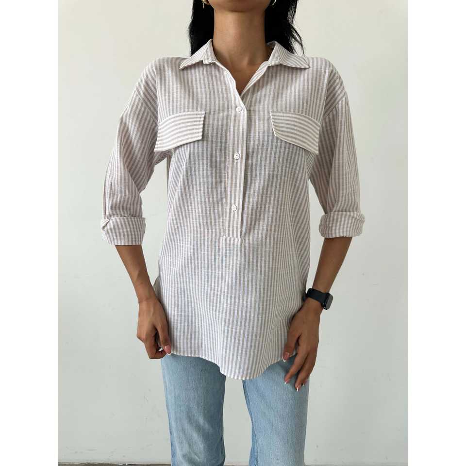 เสื้อเชิ้ตป๊อปลินลำลองสำหรับฤดูร้อน มีกระเป๋าแบบมีฝาปิด ระบายอากาศได้ดี ดีไซน์ลายทางเรียบง่ายแต่ทันสมัย