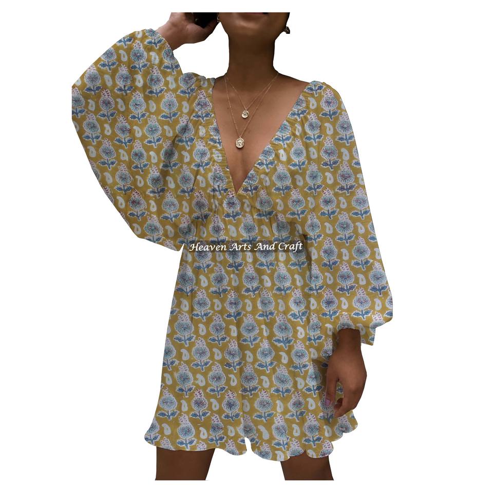 เดรสลำลองฤดูร้อนลายพิมพ์สีสันสดใส คอลึกทรงวี แขนทรงกระบอกสำหรับผู้หญิง พิมพ์ลายด้วยมือ ขายดีในกลุ่มเดรสลำลองคอลึกทรงวี