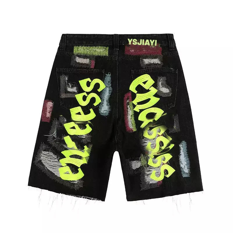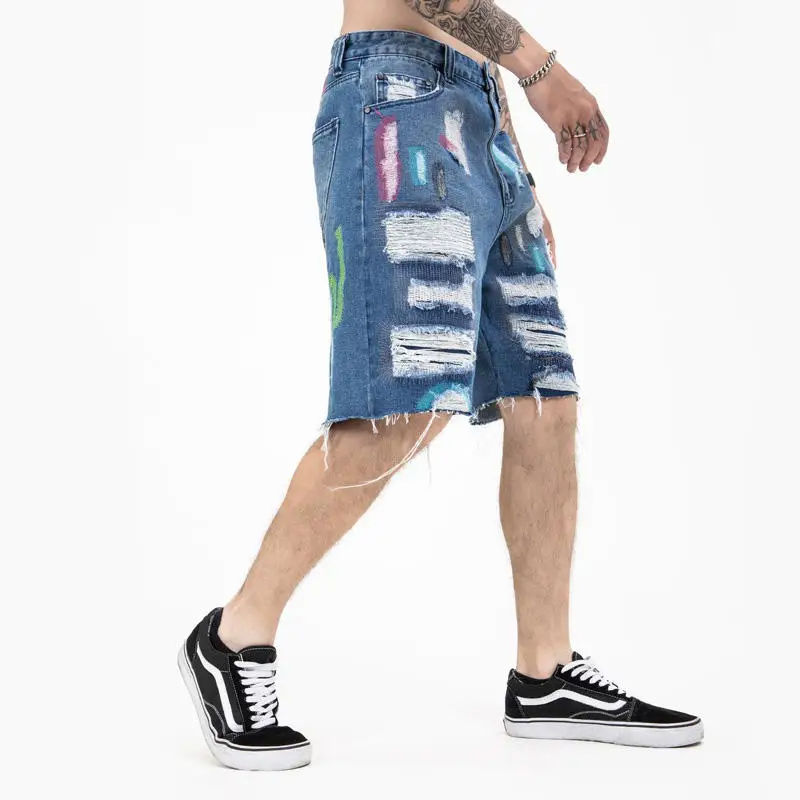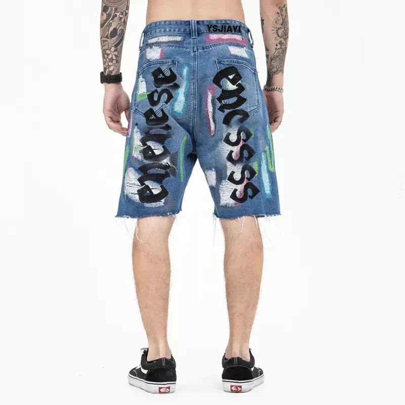 กางเกงขาสั้นผ้ายีนส์ผู้ชายแนวสตรีทแวร์ลำลองฤดูร้อนปักลายกระดุมกลางเอวตกแต่งสไตล์กางเกงยีนส์สไตล์แฟนหนุ่ม