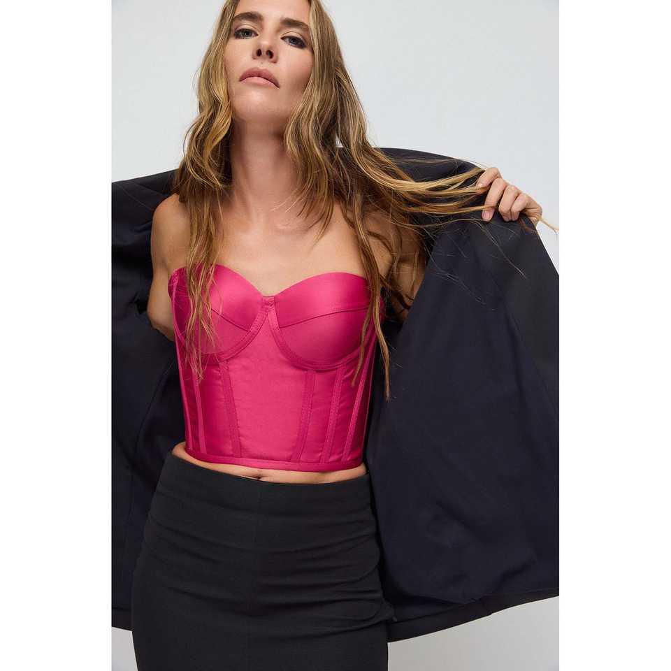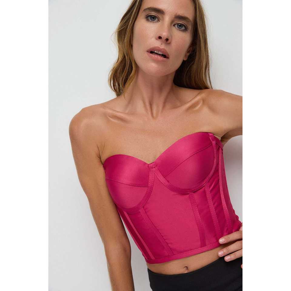 เสื้อครอปแบบมีโครงเสริมทรง พร้อมสายรัดเอว โลโก้ด้านหน้า แบบเปิดไหล่