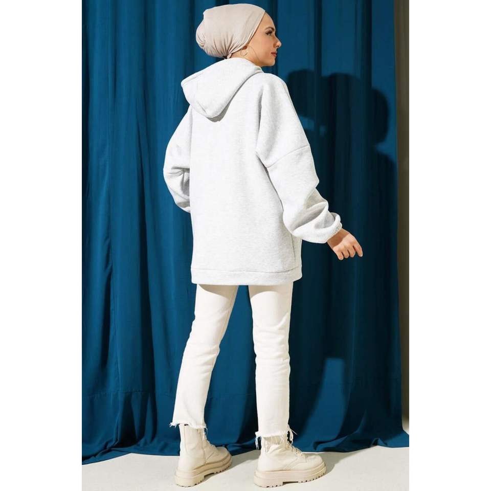 เสื้อมีฮู้ดแบบลำลองสามด้ายโอเวอร์ไซส์สีเทาอ่อนระบายอากาศและพิมพ์ลายด้วยเทคนิคการพิมพ์พัฟ