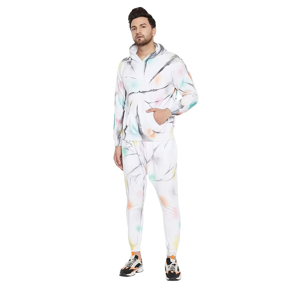 ชุดลำลองผู้ชายแบบ OEM ลาย Tie Dye เสื้อฮู้ดคอกลม 2 ชิ้น เสื้อสเวตเชิ้ตและกางเกงจ็อกเกอร์ ชุดวอร์มพิมพ์ลาย