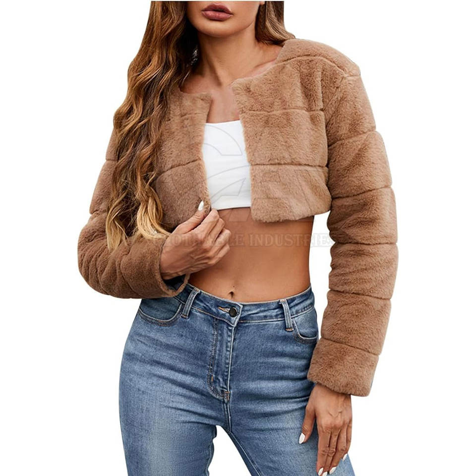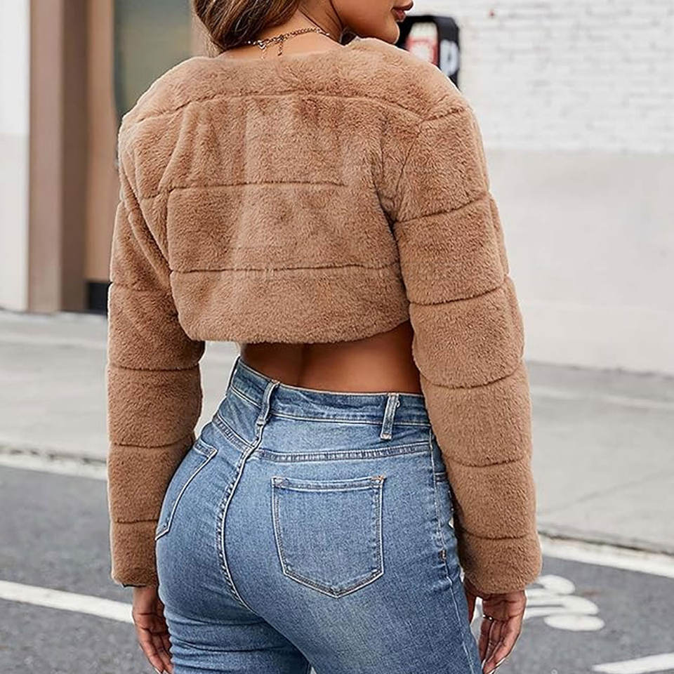 เสื้อแจ็คเก็ตขนเฟอร์เทียมครอปสำหรับผู้หญิง