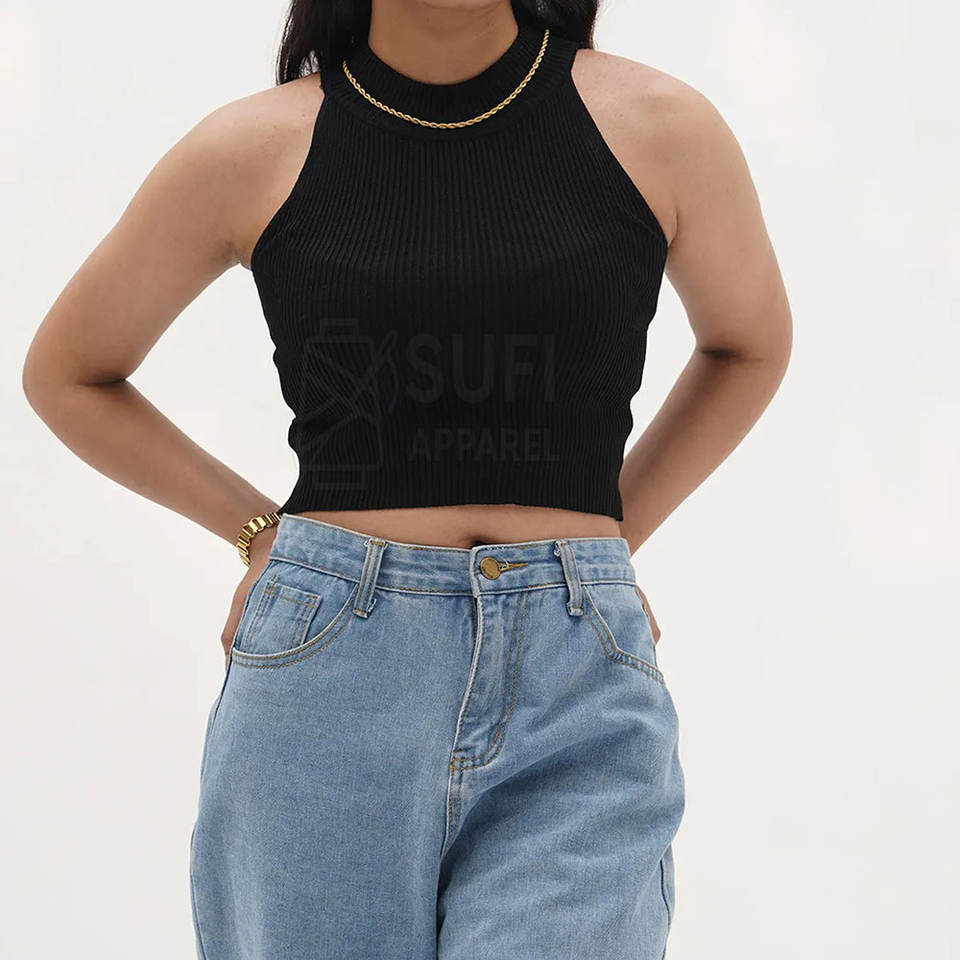 เสื้อครอปถักแบบสบายๆ สำหรับผู้หญิง ระบายอากาศได้ดี ผลิตในปากีสถาน คุณภาพสูง แห้งเร็ว ด้านหน้ามีโลโก้ สีดำ