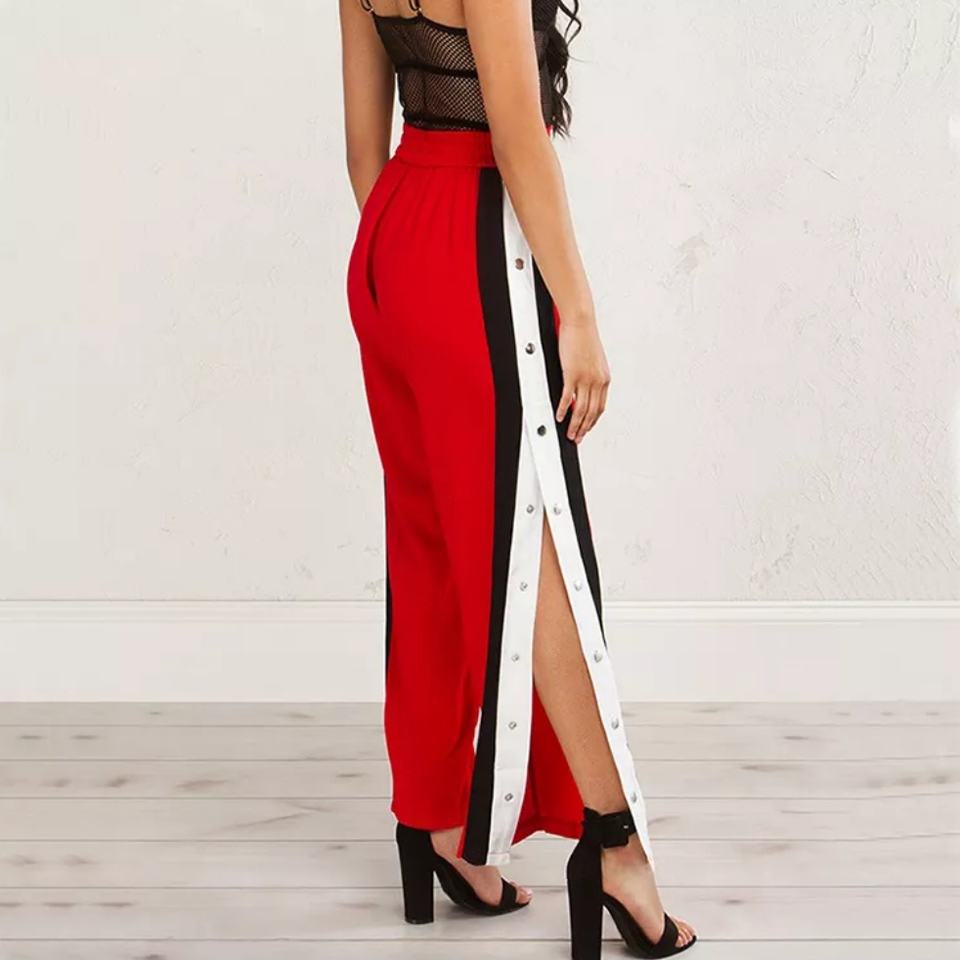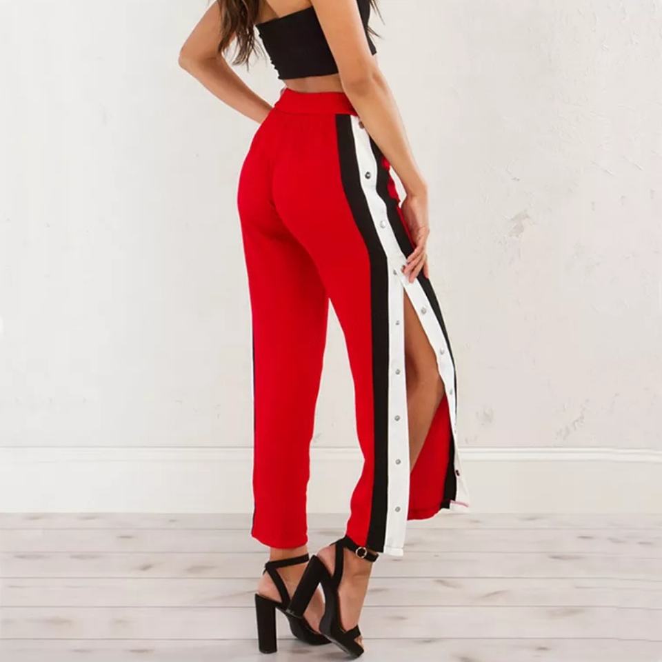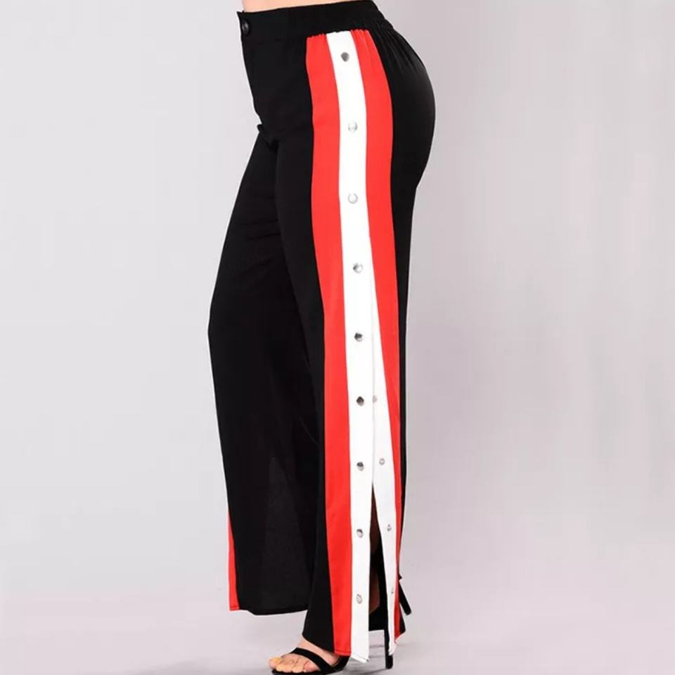 กางเกงลำลองผู้หญิงทรงขาบานแบบครอป ติดกระดุมด้านข้าง ลายทาง ผ้าโพลีเอสเตอร์
