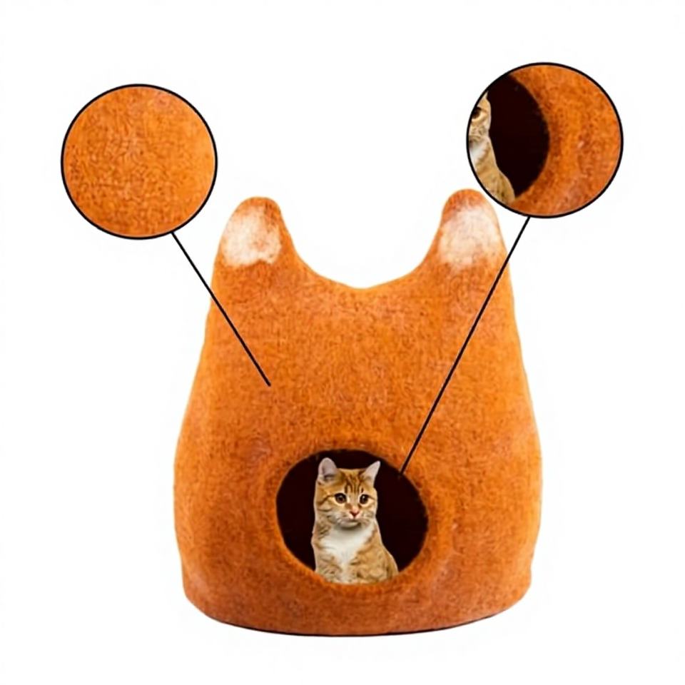 บ้านสัตว์เลี้ยงขนสัตว์ดีไซน์หูแมวสีขาวธรรมชาติ ผลิตจากขนสัตว์แท้ ให้ความสะดวกสบายสำหรับเพื่อนขนฟู