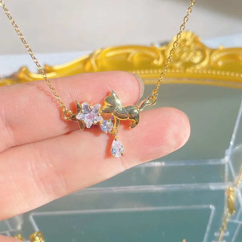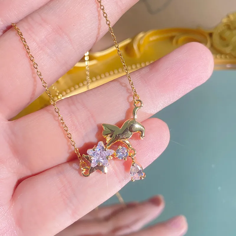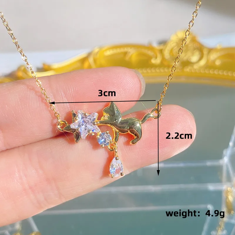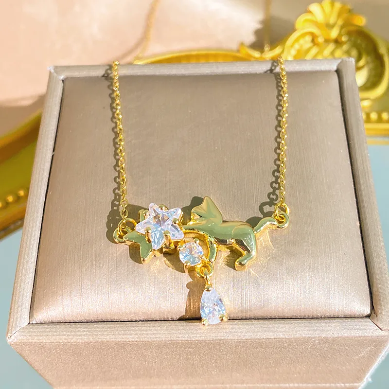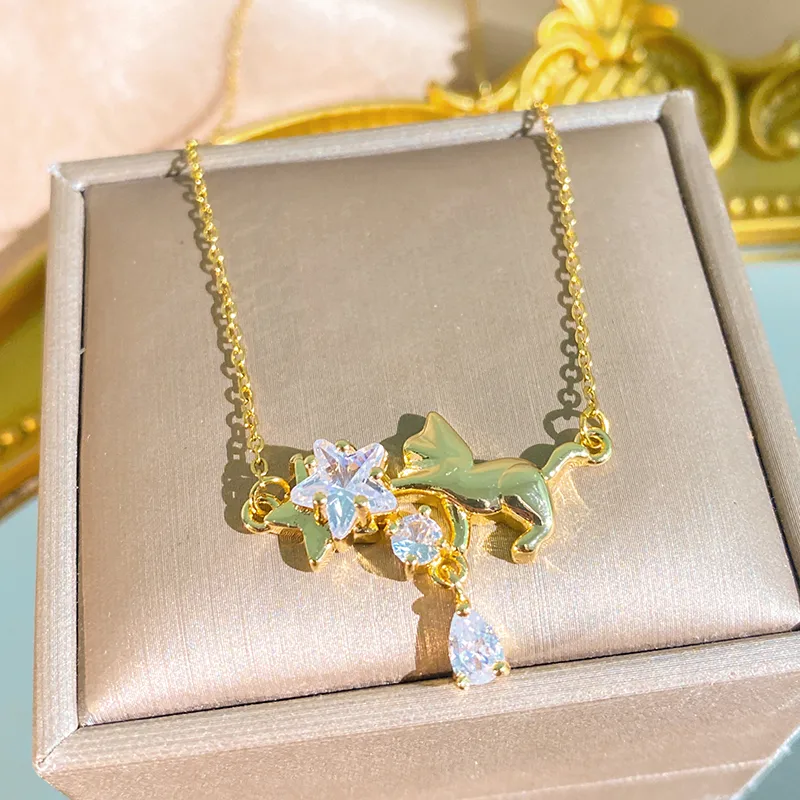 สร้อยคอรูปแมวสำหรับผู้หญิง ประดับด้วยเพทาย สแตนเลส 304 ชุบทองด้วยการเคลือบหนา 0.03µm พร้อมสายโซ่แบบเคเบิล