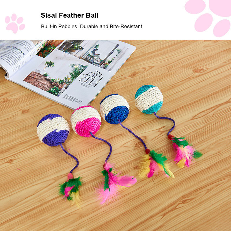 ของเล่นลูกบอลข่วนเล่นสำหรับแมว ทำจากใยไซซอลและขนนก เป็นมิตรต่อสิ่งแวดล้อม ของเล่นเสริมสร้างปฏิสัมพันธ์ สนุก ตลก ฝึกฝน ทนทาน ไม่แตกหักง่าย
