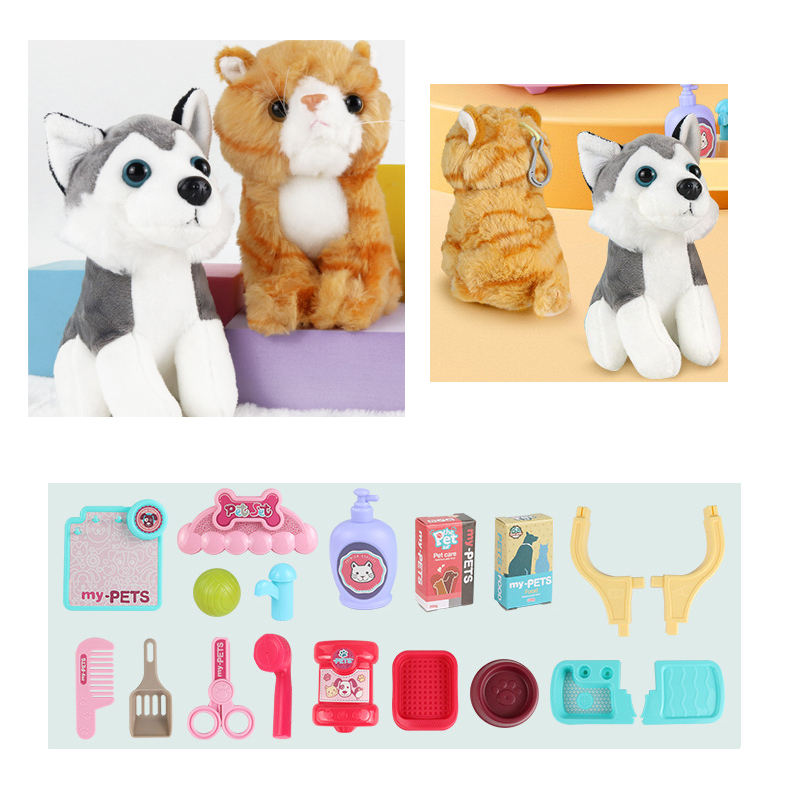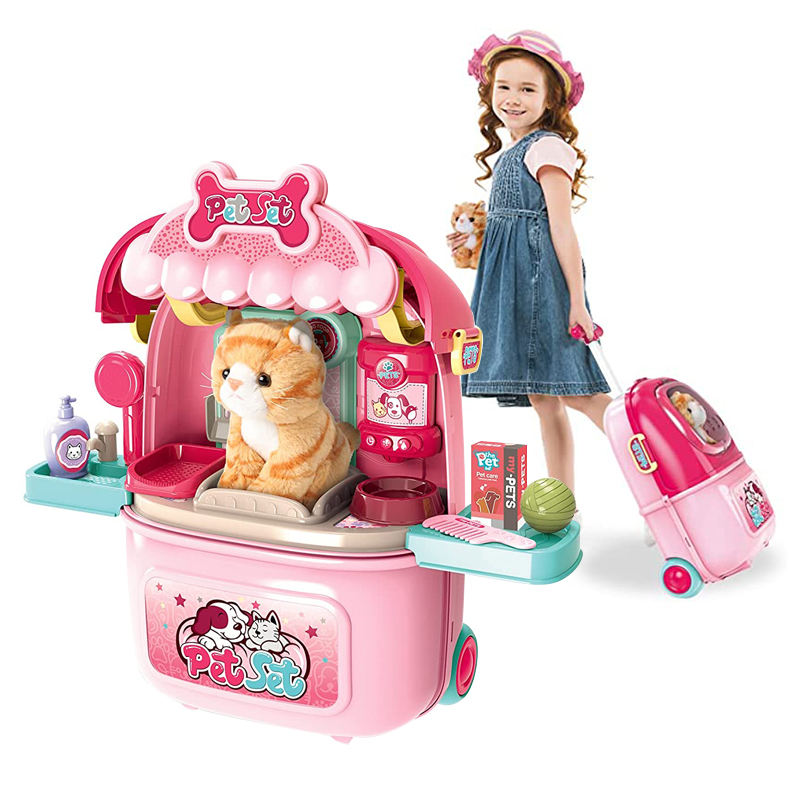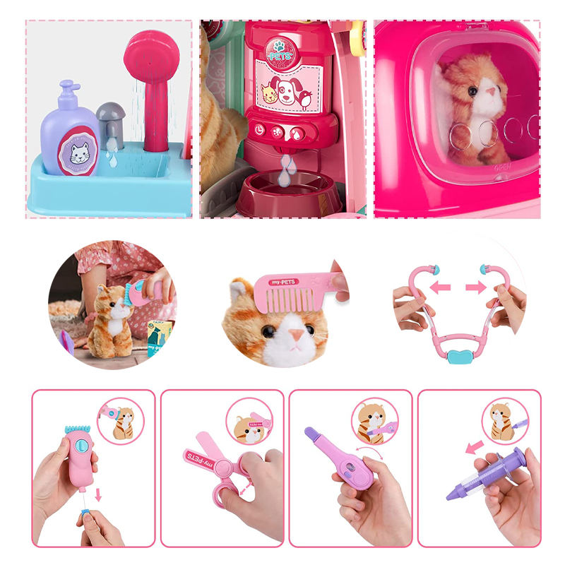 ชุดของเล่นสัตวแพทย์ดูแลแมวให้อาหารสัตว์เลี้ยงกระเป๋าเดินทางทางการแพทย์สำหรับเด็ก