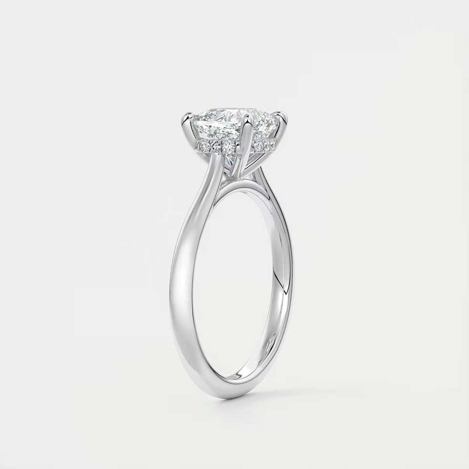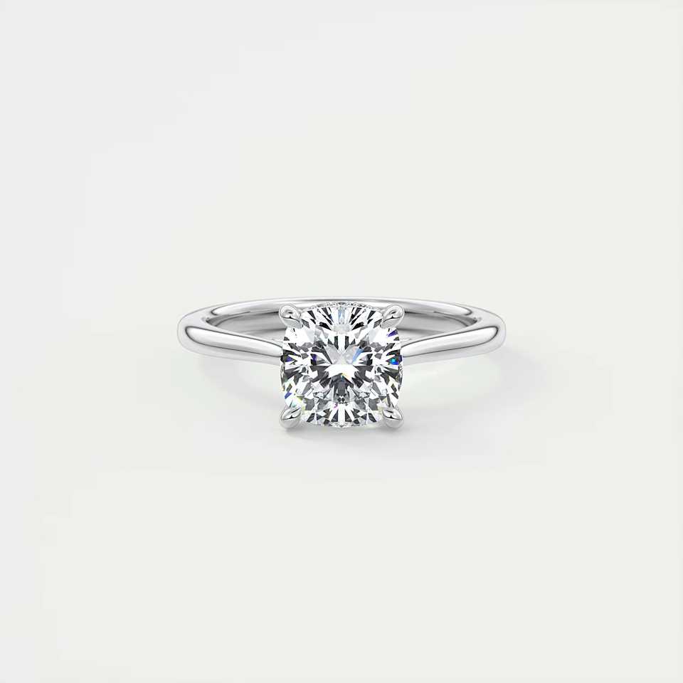 แหวนหมั้นทรง Cathedral แบบวงแหวนซ่อนประดับเพชรทรง Cushion Cut น้ำหนัก 2.80 กะรัต เพชรเพาะเลี้ยง และทองคำขาว 14k