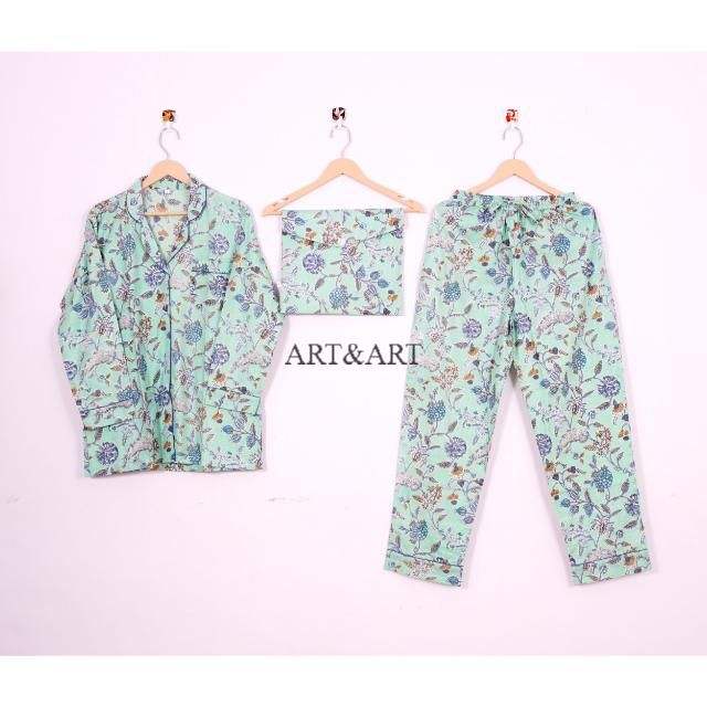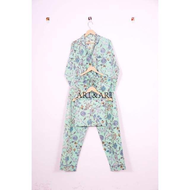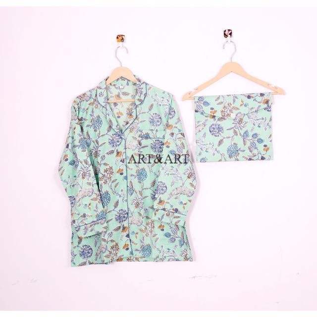 ชุดนอนลำลองลายดอกไม้พิมพ์ลายด้วยมือ ผ้าฝ้าย แขนยาว สำหรับผู้หญิง ใส่หน้าร้อน ชุดนอนสำหรับนอนหลับ
