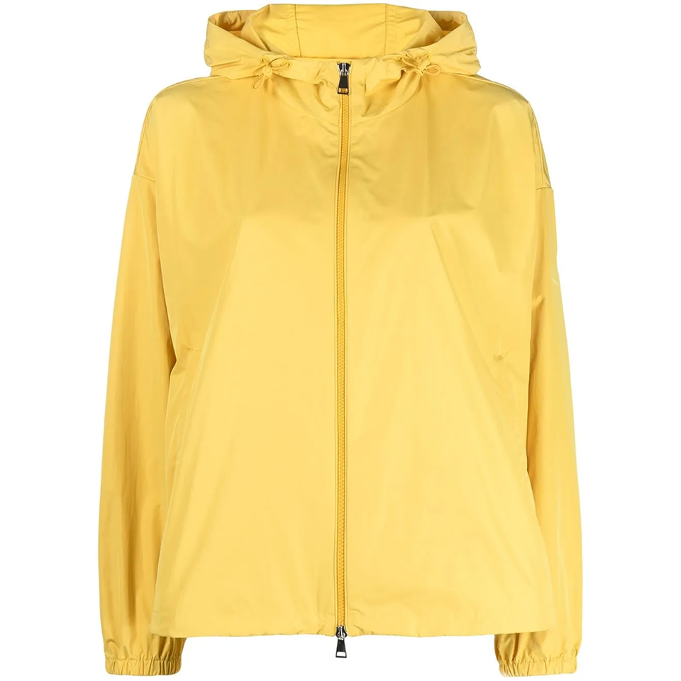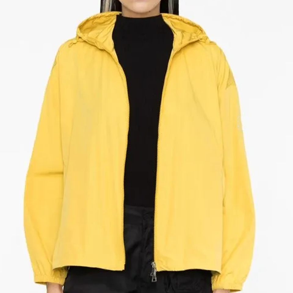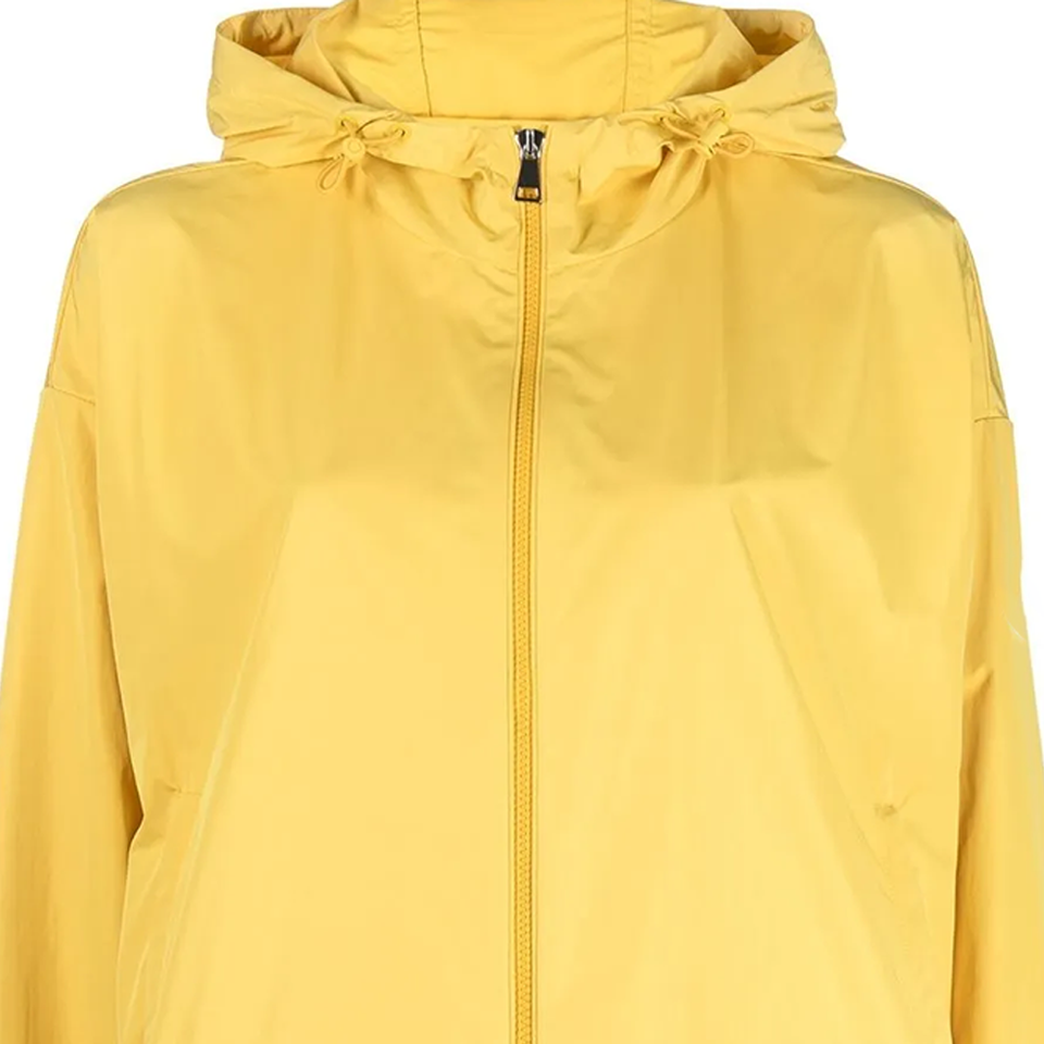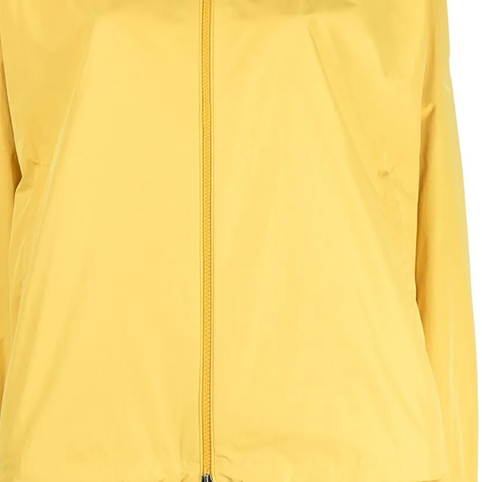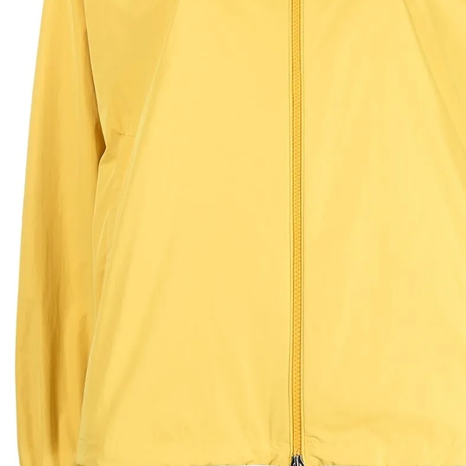 เสื้อแจ็คเก็ตกันลมกันน้ำสีเหลืองไซส์พลัส รุ่น Cecile พร้อมฮู้ด ซิปสองทาง ปลายแขนยางยืด ปรับชายเสื้อได้ พร้อมป้ายโลโก้ลายเซ็น