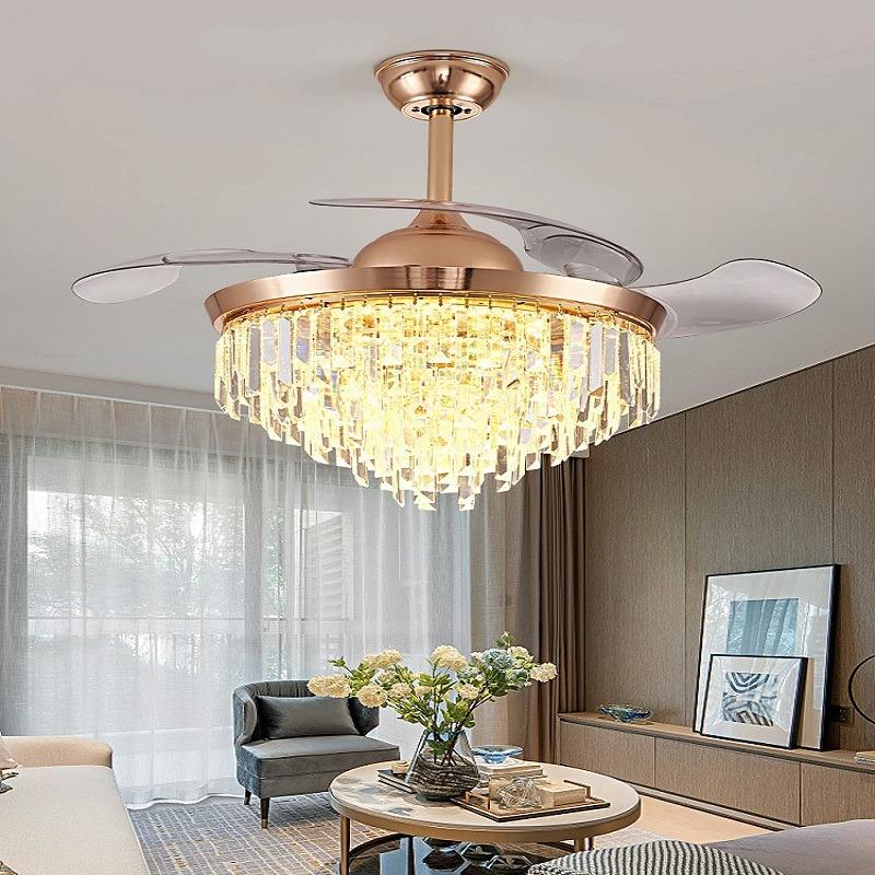 พัดลมเพดานพร้อมไฟสีทอง โมเดิร์น แฟนซี พัดลมเพดานคริสตัล LED พร้อมใบพัดใส