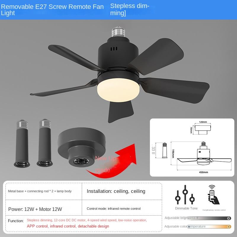พัดลมเพดานแอลอีดีหัวเคลื่อนที่ได้พัดลมหรี่แสงอัจฉริยะตกแต่งบ้าน360รีโมทคอนโทรล E27พัดลมเพดาน
