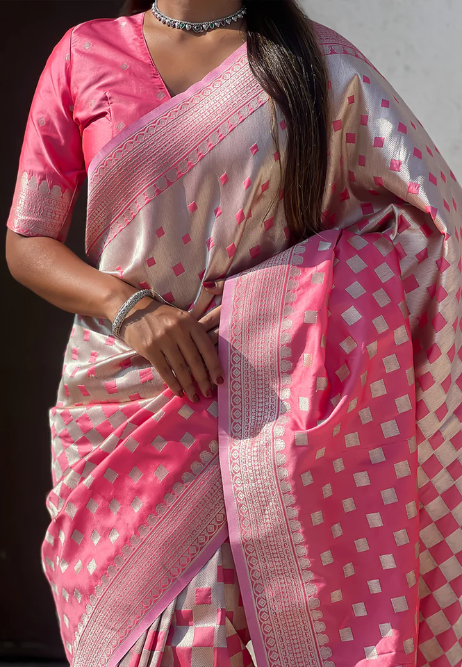 เฉลิมฉลองความหรูหราเล็กๆน้อยๆในส่าหรีผ้าไหมนุ่ม Banarasi สีชมพูที่มี3D ที่ละเอียดอ่อนและทอ zari ให้รายละเอียดที่ดูสง่างาม