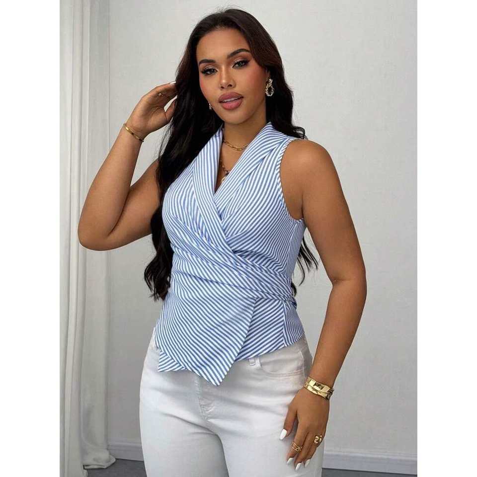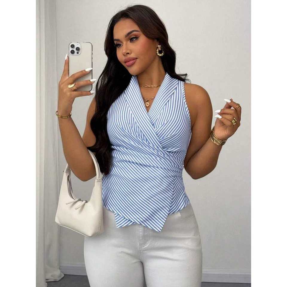 Celure เสื้อแขนกุดผูกด้านหน้าสำหรับผู้หญิง, เสื้อแขนกุดผูกเชือกแขนกุดสีขาวสีฟ้าแนวธุรกิจลำลองหรูหรา