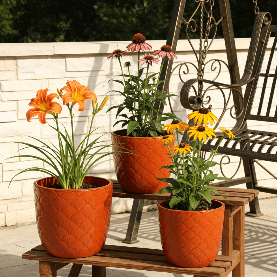 ชุดกระถางดอกไม้เซรามิกเคลือบเงาสีส้มลายเกล็ดปลา แบบมีรูระบายน้ำ เป็นมิตรกับสิ่งแวดล้อม ใช้ได้ทั้งภายในและภายนอกอาคาร