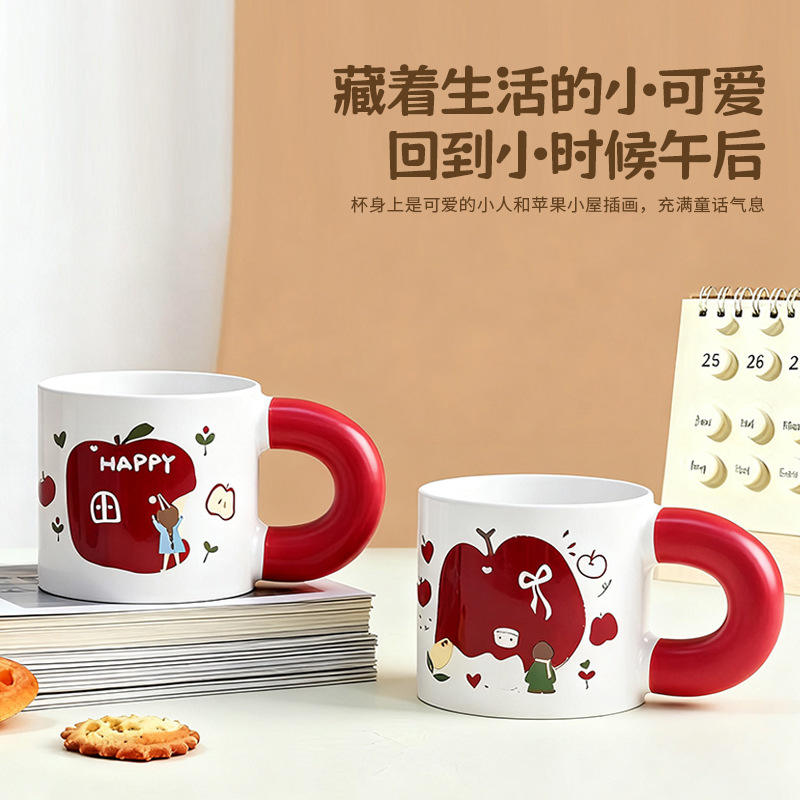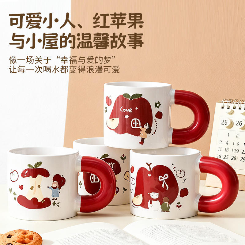 แก้วเซรามิคลายการ์ตูนแอปเปิ้ลน่ารัก แก้วน้ำคู่รัก ใช้ในบ้าน ของขวัญวันเกิด