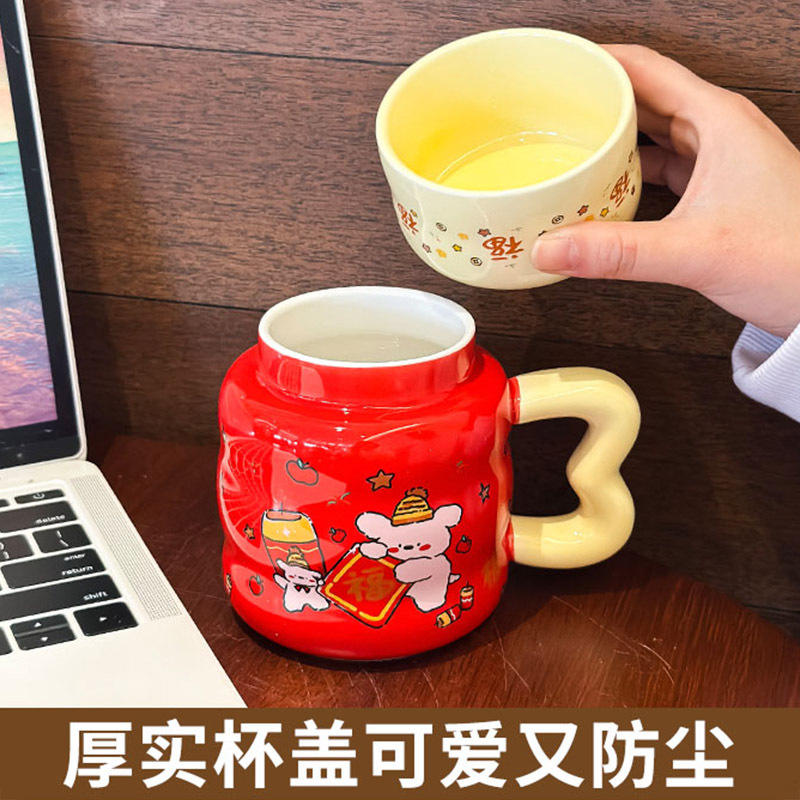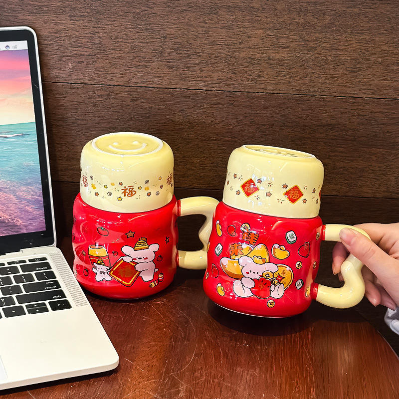 แก้วเซรามิคสีแดงลายการ์ตูนพร้อมฝาและหูจับ สำหรับของขวัญทางธุรกิจ ฤดูใบไม้ผลิ 2025