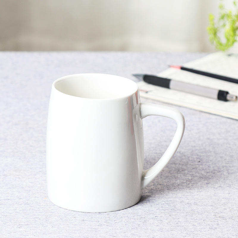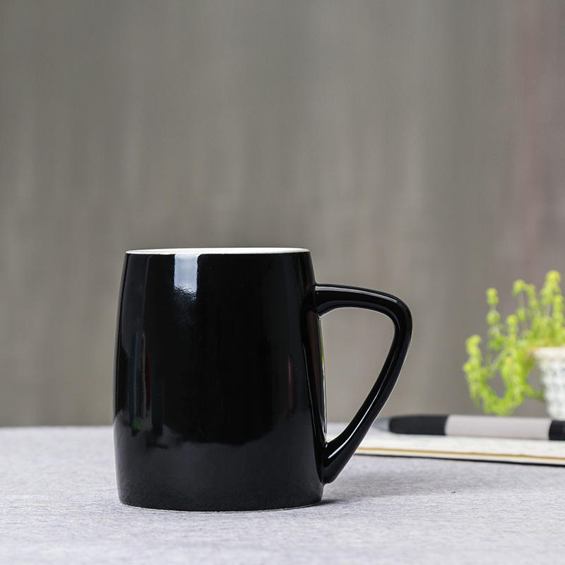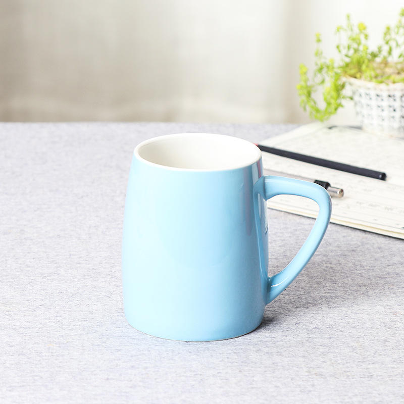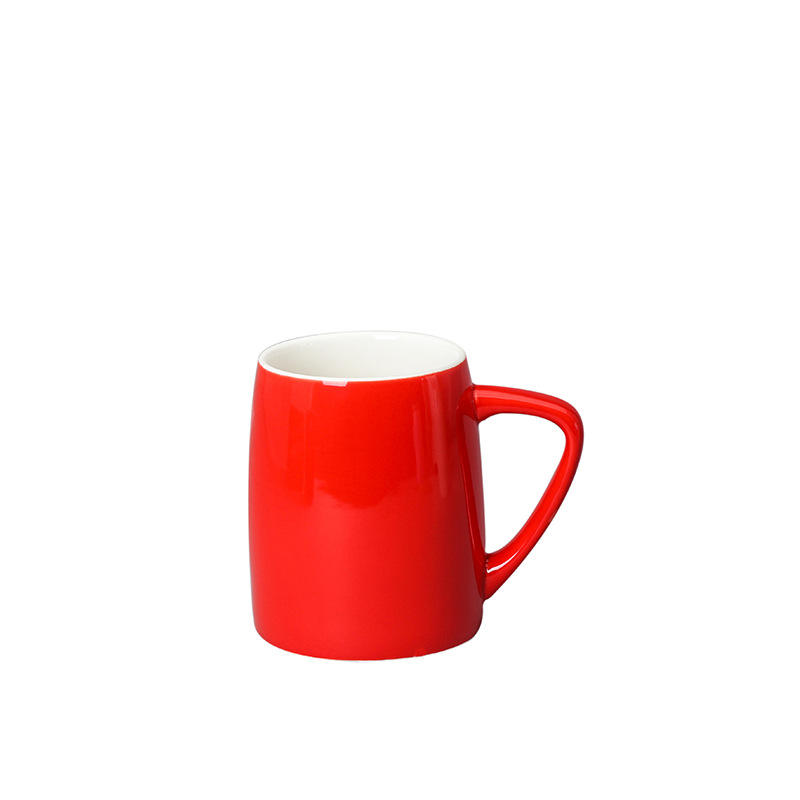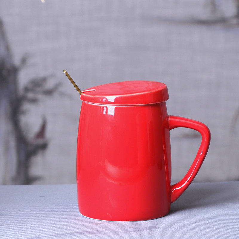 แก้วเซรามิกสีแดงล้วนพร้อมฝาและช้อนสำหรับดื่มชาหรือนมในออฟฟิศ