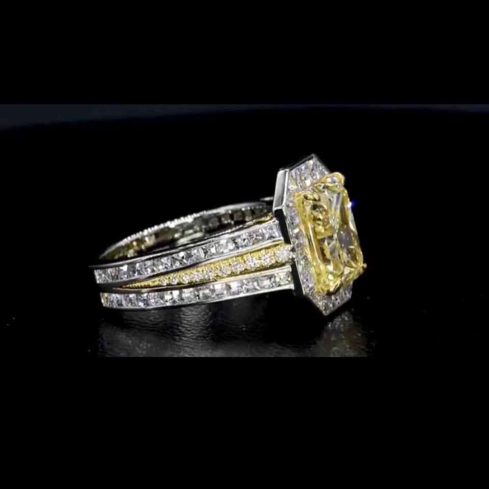 แหวนแต่งงานเพชรเหลืองแฟนซีวิวิดทรงรัศมี 1.50 กะรัต ได้รับการรับรองแล้ว ประดับด้วยเพชรทรงแปดเหลี่ยมแบบวงแหวนสามแถว ทองคำแท้ 18K