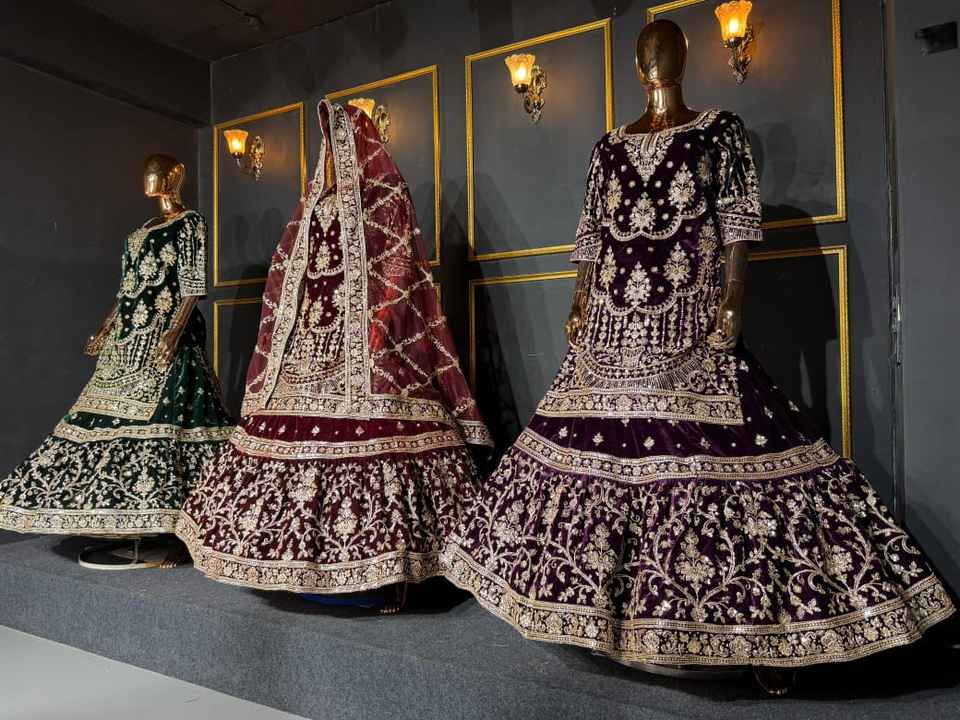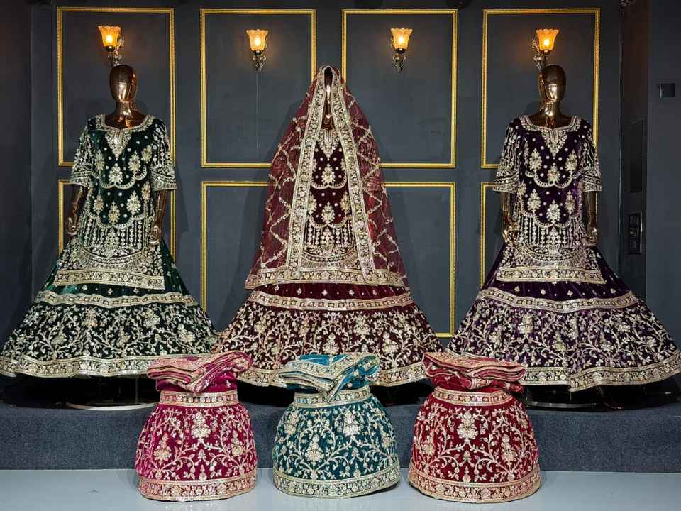ชุดเลเฮนกาโชลีผ้ากำมะหยี่ปักลายอย่างประณีต ยาวถึงพื้น ไม่ยับง่าย ตกแต่งด้วยรายละเอียดหรูหรา โดดเด่นมีสไตล์ เหมาะสำหรับชุดเจ้าสาว