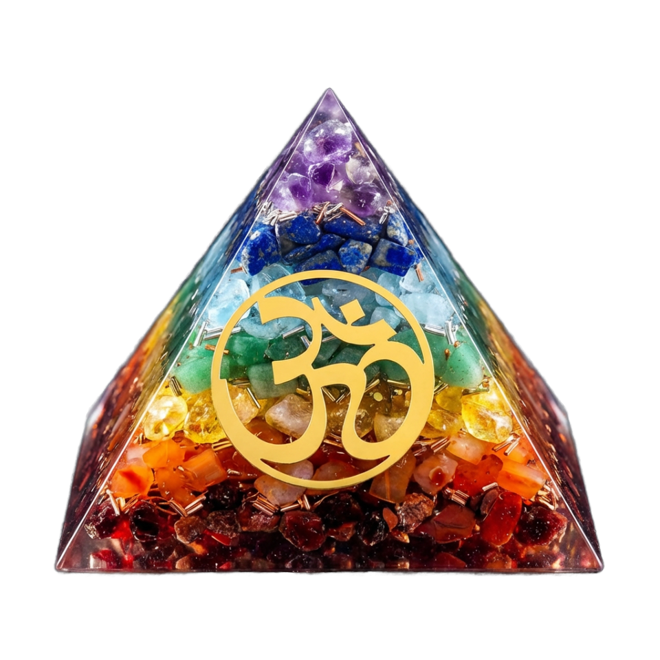 พีระมิดออร์กอนหินหลายชั้นพร้อมสัญลักษณ์โอม | การจัดตำแหน่งพลังงานตามหลักฮวงจุ้ย การป้องกันพลังงานรอบตัว การทำสมาธิ และการตกแต่งทางจิตวิญญาณ
