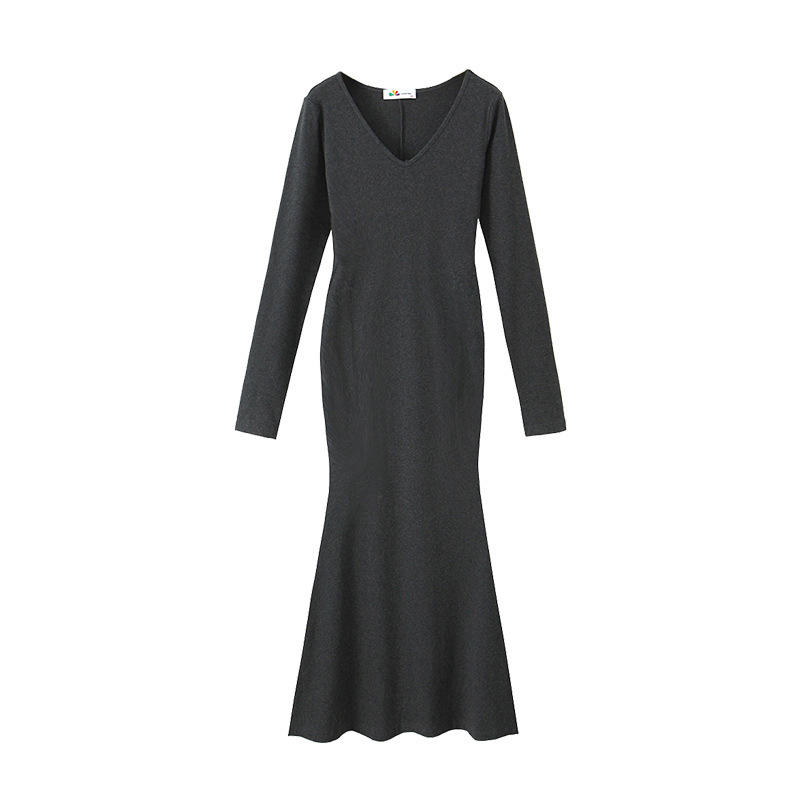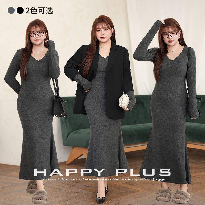 เดรสไหมพรมทรงเข้ารูปคอวีแบบแชมเปญกลาส ไซส์พลัส 9046 ทรงฝรั่งเศสเข้ารูปทรงแม็กซี่