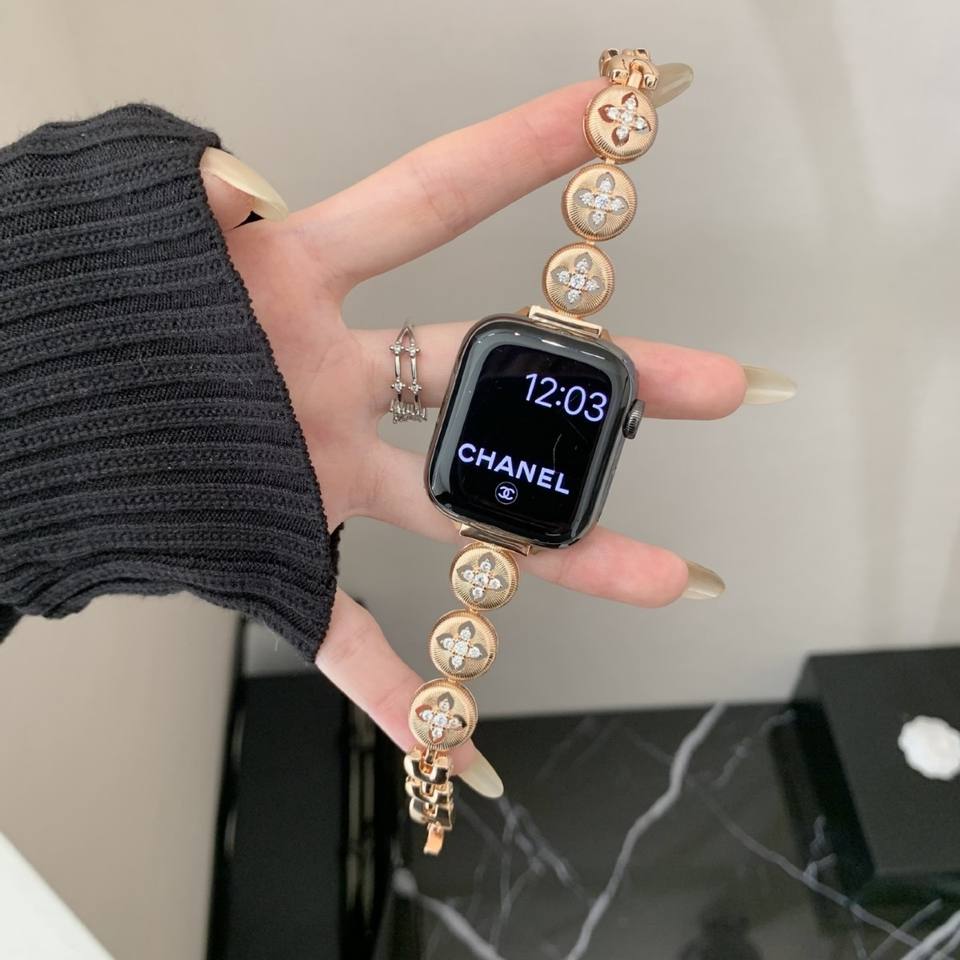 สายนาฬิกาข้อมือชุบทองลายดอกไม้สไตล์ชาแนลสำหรับแอปเปิ้ลวอทช์ 40 มม. สายโลหะแฟชั่นสุดหรู