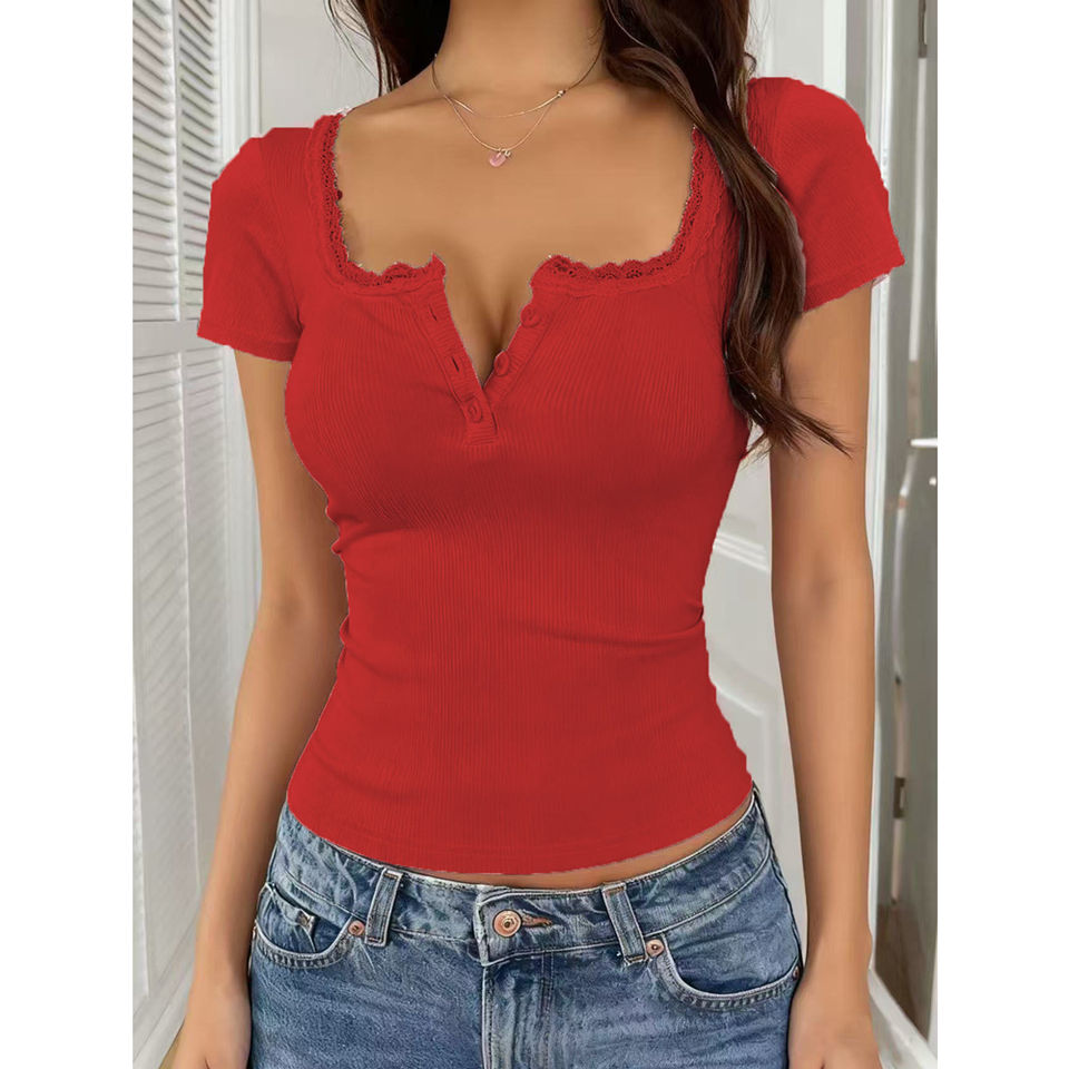เสื้อยืดครอปแขนสั้นทรงเข้ารูป คอวี แต่งลูกไม้ รุ่น Y2K สำหรับผู้หญิง ไซส์ XS-3XL เหมาะสำหรับฤดูร้อน