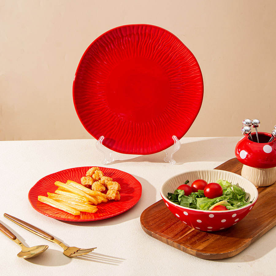 ชุดชามและจานเซรามิคลายเห็ดนอร์ดิกเฉาโจว สีแดงลายจุด สำหรับผู้ใหญ่ ใช้เป็นของขวัญ