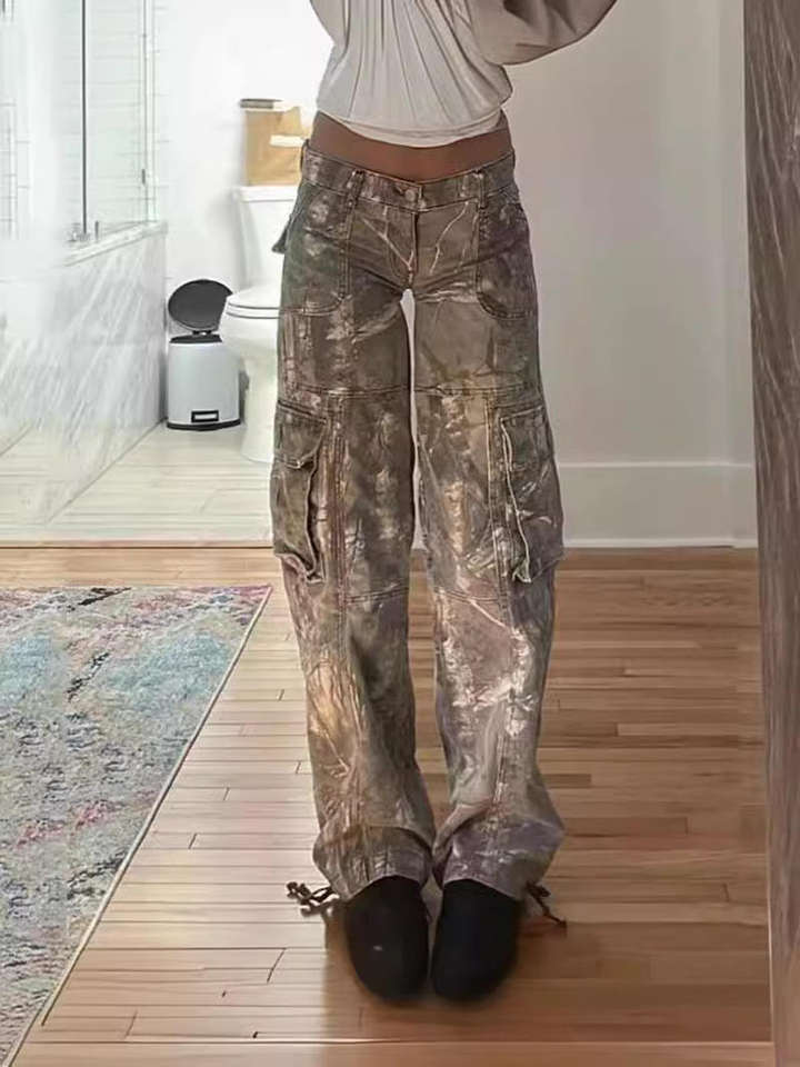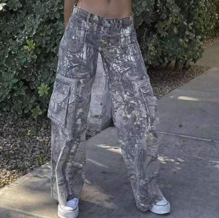 Charm 2025 Hot Sale Autumn Overalls Girls Camouflage Pants Straight Loose Low Rise Pockets Jeans for Women