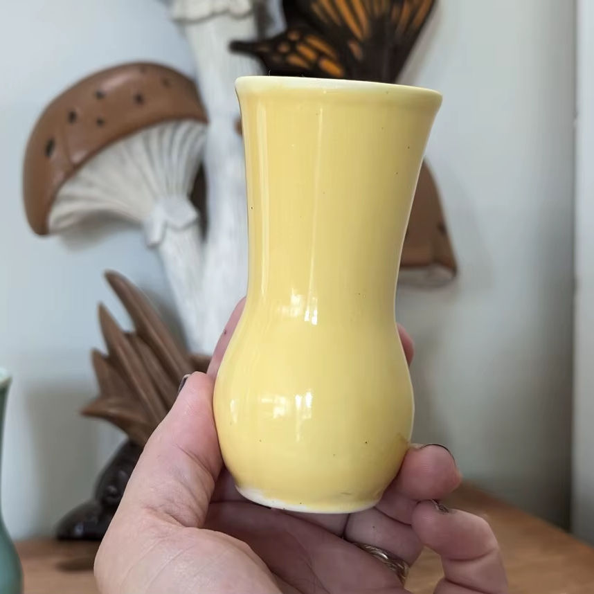 แจกันเซรามิกสีเหลืองเนียนสวย รูปทรงโค้งมน ผิวมันเงา พร้อมดีเทลสะดุดตาสำหรับการตกแต่งสไตล์โมเดิร์น