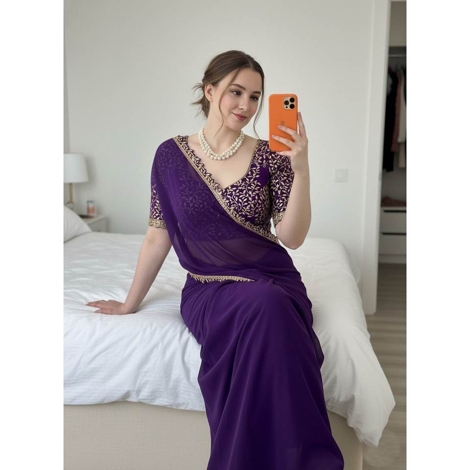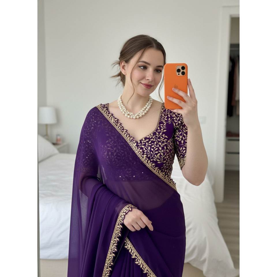 สารีชีฟองที่มีเสน่ห์งานปักที่สวยงามและลูกไม้ขอบตรงเงา