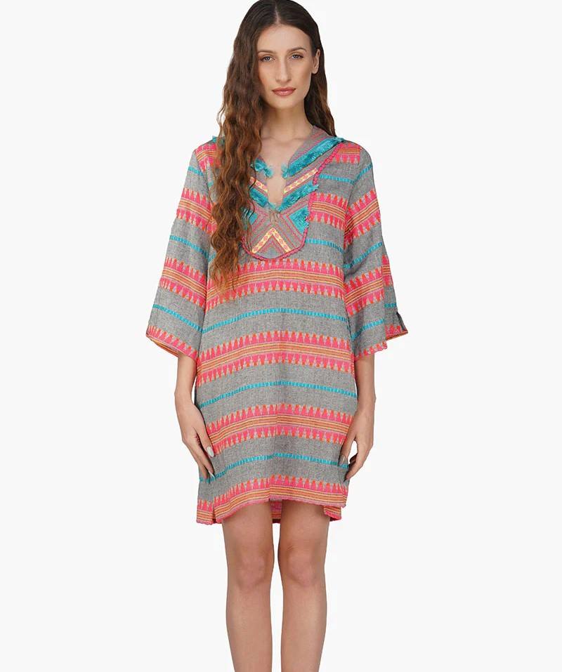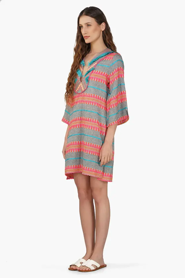 เสื้อคาฟตันดีไซน์เนอร์มีสเน่ห์คอวีทอเนื้อแน่นและลูกไม้มีรายละเอียดที่ลงตัวของสไตล์และสง่างาม