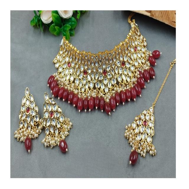 ชุดเครื่องประดับมอสซาไนต์คุณภาพสูงทรงเสน่ห์ พร้อมมุกประดับแบบคุนดัน ชุดสร้อยคอพร้อมต่างหูและติกก้าสำหรับผู้หญิง เหมาะสำหรับงานแต่งงาน