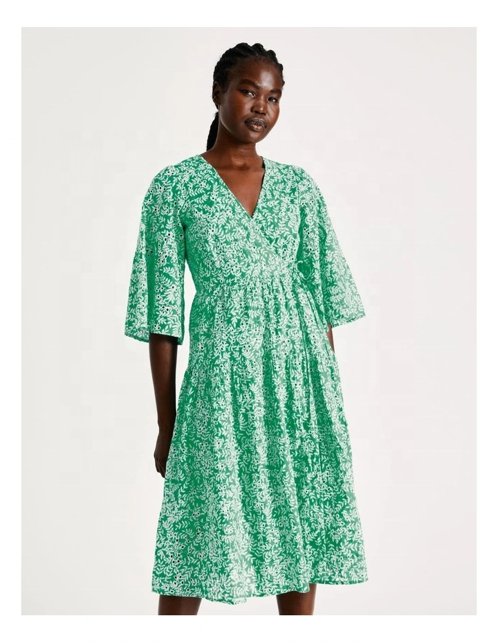 เดรส100% เอวผ้าฝ้ายพิมพ์ลายกึ่งโปร่งแขน3/4ทรงพอดีตัวคอวีพิมพ์ลายตารางผูกเอว