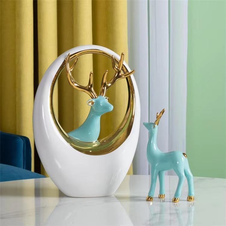 รูปปั้นคาริบูสีขาวและสีฟ้าที่มีเสน่ห์การแสดงบนโต๊ะที่หรูหราเน้นรื่นเริงน่ารักเหมาะสำหรับการตกแต่งบ้านเทศกาลคริสต์มาส