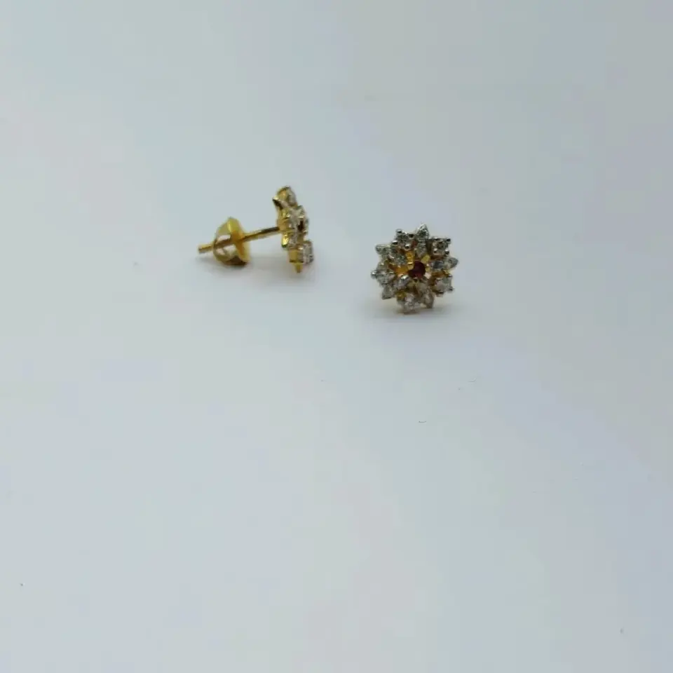 ต่างหูรูปดอกไม้สีทองที่มีเสน่ห์ ประดับด้วยหินสีขาวระยิบระยับ และหินสีแดงเม็ดใหญ่ตรงกลาง ออกแบบมาเพื่อเสริมความโดดเด่น