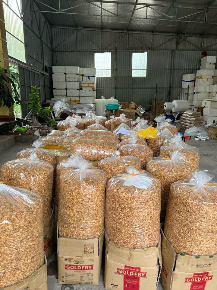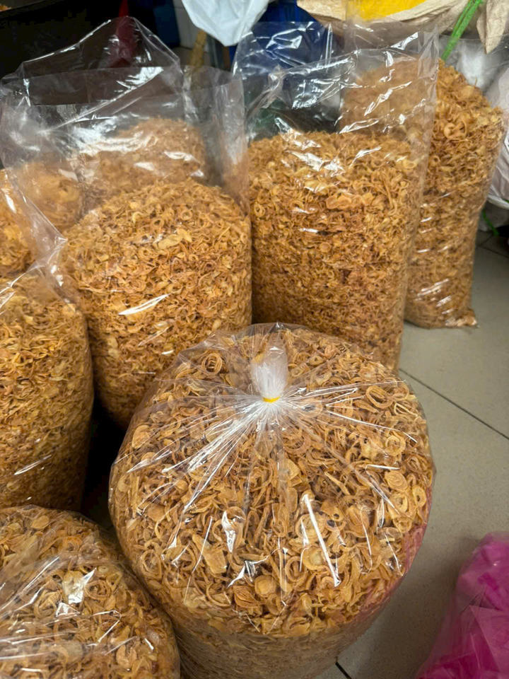 หอมแดงทอดกรอบราคาถูกและหัวหอมสีม่วงทอดสำหรับสลัดก๋วยเตี๋ยวและเครื่องปรุงสำหรับผัดบัวสีน้ำเงิน