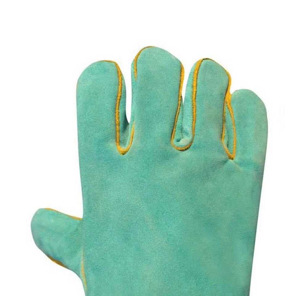 ถุงมือนิรภัยหนังวัววัวแยกชิ้นสีเหลืองถุงมือเชื่อมงานหนังสำหรับคนงานและผู้หญิง